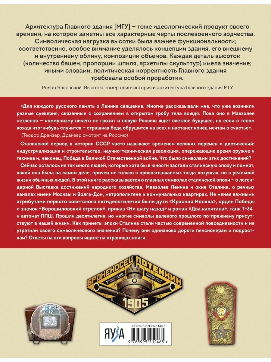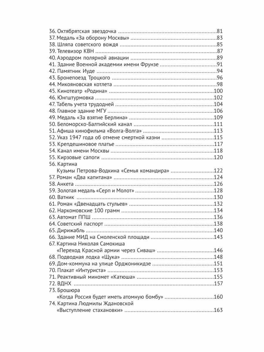 Сейчас осталось не так много людей, которые хотя бы в юности застали сталинскую эпоху и помнят, какой она была на самом деле, причём — не только в провозглашаемых тогда лозунгах, но в реальной жизни обычных людей. В этой книге рассказывается о главных символах сталинской эпохи — легендарной Выставке достижений народного хозяйства, Мавзолее Ленина и окне Сталина, о речных каналах имени Москвы и «Волга—Дон», метрополитене и коммунальных квартирах. Не менее важными атрибутами первого советского пятидесятилетия были духи «Красная Москва», орден Победы и значок «Ворошиловский стрелок», приказ «Ни шагу назад» и роман «Два капитана», танк Т-34 и автомат ППШ.