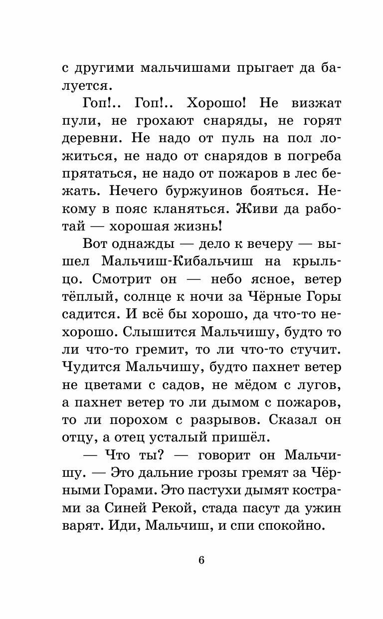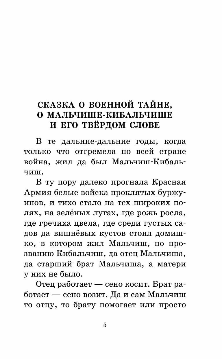 "Сказка о Военной тайне, о Мальчише-Кибальчише и его твёрдом слове" (1933) - это история о смелом мальчике, отец и старший брат которого ушли на войну с буржуинами. Отважный Мальчиш не побоялся дать отпор врагам, поднять других ребят на борьбу со злом. Сильный духом герой сказки стал примером для миллионов советских детей. В книгу также вошли рассказы "Голубая чашка", "Дым в лесу", "Горячий камень", "У переправы", "Четвёртый блиндаж", "Совесть", "Поход" и другие.