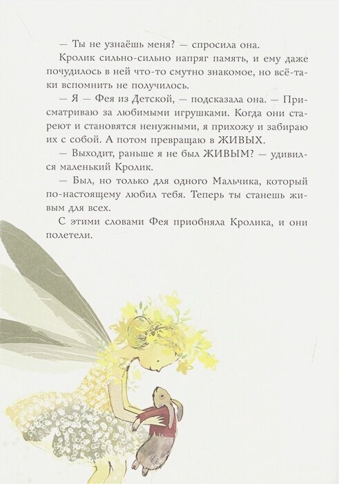 Автор «Плюшевого кролика», знаменитая британская писательница Марджери Уильямс, совершенно уверена: да, могут! Но оживить их способна только искренняя и нежная детская любовь. Любая игрушка – большая или маленькая, старая или новая, дорогая или не очень – становится живой, когда ребёнок по-настоящему привязывается к ней, а не просто играет. Так случилось и с маленьким Плюшевым кроликом.