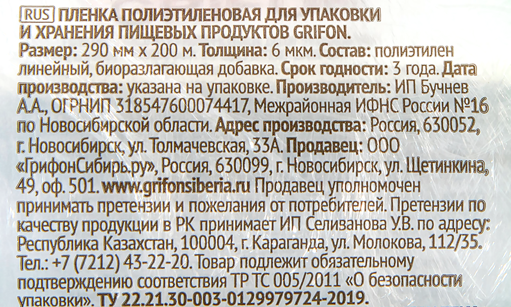 Пищевая пленка GRIFON GR SIBIRSKAYA, 29 см х 100 м 200-100 S используется для упаковки мяса, сыра, фруктов или любых других продуктов. К её очевидным преимуществам можно отнести прочность, хорошую растяжимость и газопроницаемость. Пленка позволяет пропускать кислород, а наружу выпускать углекислый газ, именно поэтому внутри не накапливается конденсат.Благодаря барьерным свойствам пищевая пленка продлевает срок хранения продуктов и они дольше остаются свежими. Пленку можно использовать для герметизации и для запечатывания готовых блюд в пищевых контейнерах. Идеальная клейкость поверхности и высокий уровень прочности и растяжимости пленки позволяют сохранить свежесть приготовленных блюд в течение продолжительного времени.