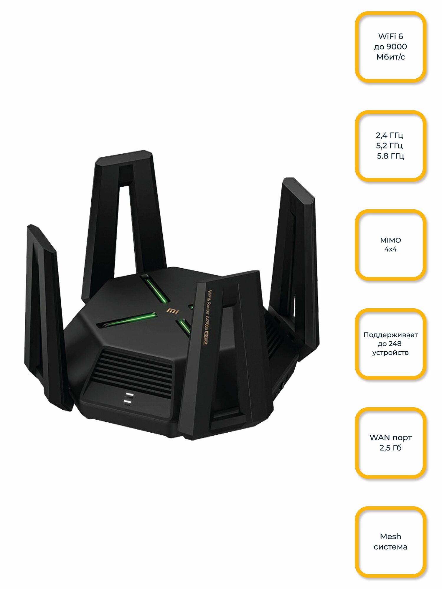 Роутер Xiaomi Mi Wi-Fi Router Black (AX9000) способен поддерживать беспроводные соединения стандарта Wi-Fi6 и допускает подключение до 1000 устройств одновременно. Используйте его для подключения большого количества устройств, работайте, смотрите фильмы, играйте в игры с высокой скоростью передачи данных.Устройство поддерживает одновременную работу на 3 диапазонах частот. По сравнению с двухдиапазонным маршрутизатором, Xiaomi Mi Wi-Fi Router AX9000 создает сверхвысокую пропускную способность без помех от других устройств.Роутер поддерживает высокоскоростную передачу данных 4K QAM. С устройством QAM 4K, прибор ускоряется на 20%. Xiaomi Mi Wi-Fi Router AX9000 оснащен 4-ядерным процессором Qualcomm 2,2 ГГц и 2-ядерным двигателем ускорения сети NPU 17 ГГц. 12 независимых усилителей сигнала увеличивают мощность передачи и чувствительность приема. Каждый элемент содержит три антенны с высоким коэффициентом усиления – 2,4 ГГц, 5,2 ГГц и 5,8 ГГц, чтобы обеспечить более широкое покрытие сигнала.Технология MU-MIMO позволяет обслуживать большое количество устройств. OFDMA улучшает эффективность каждой передачи. Они объединены вместе для достижения более высокой скорости и более низкой задержки при одновременном использовании нескольких устройств. Роутер поддерживает одновременное подключение до 1000 устройств. Эта модель способна обеспечить работу крупного офисного центра, а также подходит для организации системы «умный дом».Профессиональный дизайн воздуховода оборудован сверхтихим вентилятором. Роутер автоматически регулирует скорость вентилятора в соответствии с температурой, а также эффективно рассеивает излишнее тепло во время игровых процессов, чтобы обеспечить стабильную работу.Технология AIoT обеспечивает поиск и подключение «умных» устройств Xiaomi. Используйте специальное приложение MiHome для формирования собственной сетевой системы для домашнего или офисного использования. Благодаря технологии специального поиска формируетс направленный луч для усиления сигнала, получаемого от смартфонов, ПК и других электронных устройств. Настройка доступа к сети осуществляется в один клик.
