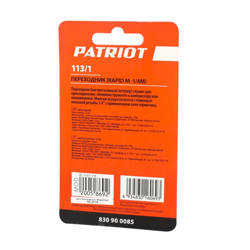**Переходник Patriot ** предназначен для оснащения компрессора. Используется для перехода с штуцера рапид на резьбу 1/4 (M). Обеспечивает прочное и надежное соединение.