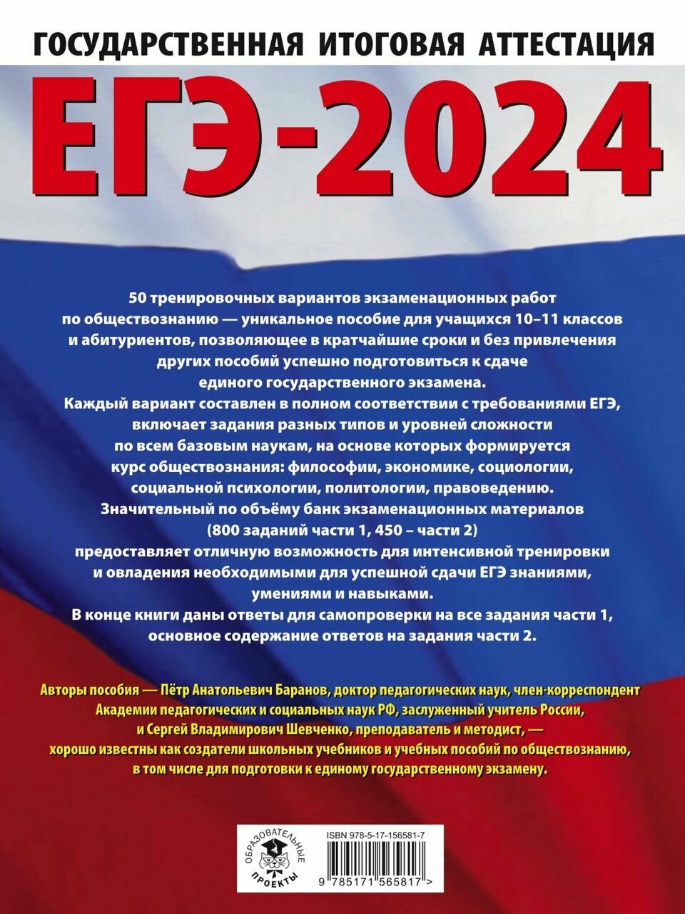 ЕГЭ-2024. Обществознание (60x84/8). 50 тренировочных вариантов экзаменационных работ для подготовки к единому государственному экзамену (Шевченко Сергей Владимирович, Баранов Пётр Анатольевич); Образовательные проекты, 2023