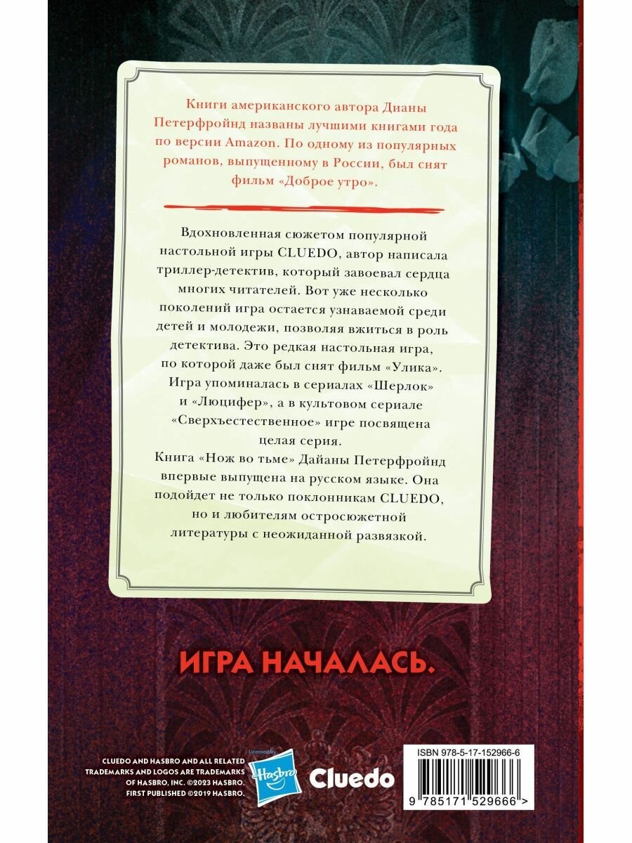 Вдохновленная сюжетом популярной настольной игры Cluedo, автор написала триллер-детектив, который завоевал сердца многих читателей. Вот уже несколько поколений игра остается узнаваемой среди детей и молодежи, позволяя вжиться в роль детектива. Это редкая настольная игра, по которой даже был снят фильм "Улика". Игра упоминалась в сериалах "Шерлок" и "Люцифер", а в культовом сериале "Сверхъестественное" игре посвящена целая серия. Книга "Нож во тьме" Дайаны Петерфройнд впервые выпущена на русском языке. Она подойдет не только для поклонников Cluedo, но любителей остросюжетной литературы с неожиданной развязкой.