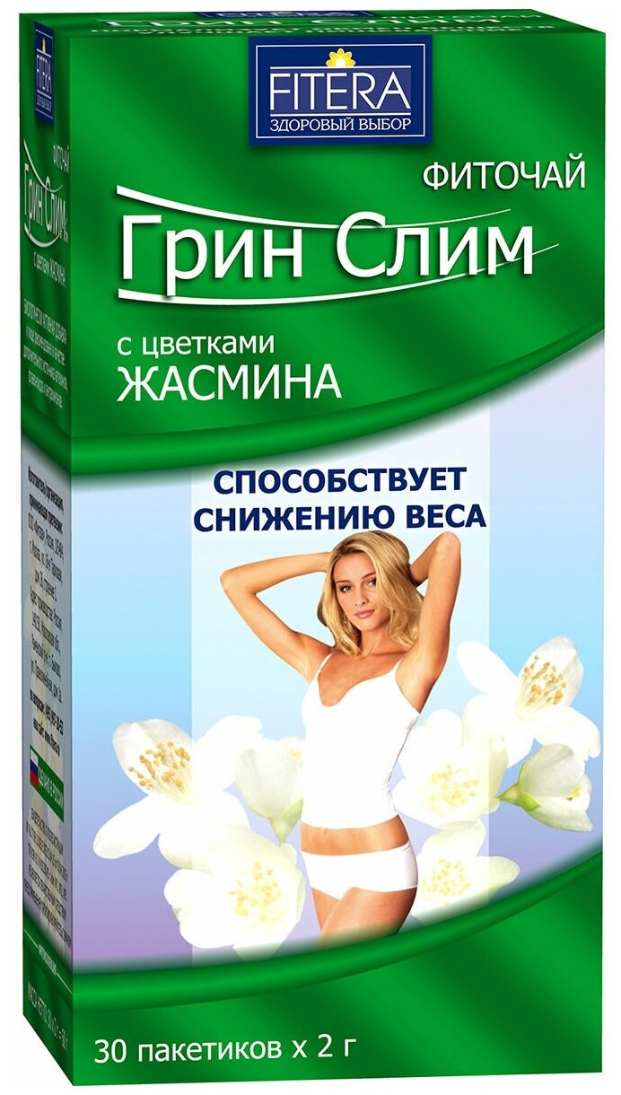 Фиточай "ФИТЭРА" Грин Слим с ароматом Жасмин- рекомендован в качестве дополнительного источника катехинов, флавоноидов, антрахинонов. Способствует снижению веса, нормализует обмен веществ, улучшает пищеварение. Внутри пачки, фильтр-пакеты упакованы в специальный пакет, изготовленный из влагонепроницаемой пищевой бумаги который позволяет сохранить свежесть, аромат и полезные свойства фиточая. Курс приема и дозировка: взрослым 1 фильтр-пакет залить стаканом кипятка, настоять 15 минут, принимать по 1 стакану настоя 2 раза в день во время еды. Продолжительность приема - 2-3 недели. Перерыв между курсами 2-3 недели. Противопоказания: беременность, кормление грудью, индивидуальная непереносимость компонентов продукта.
