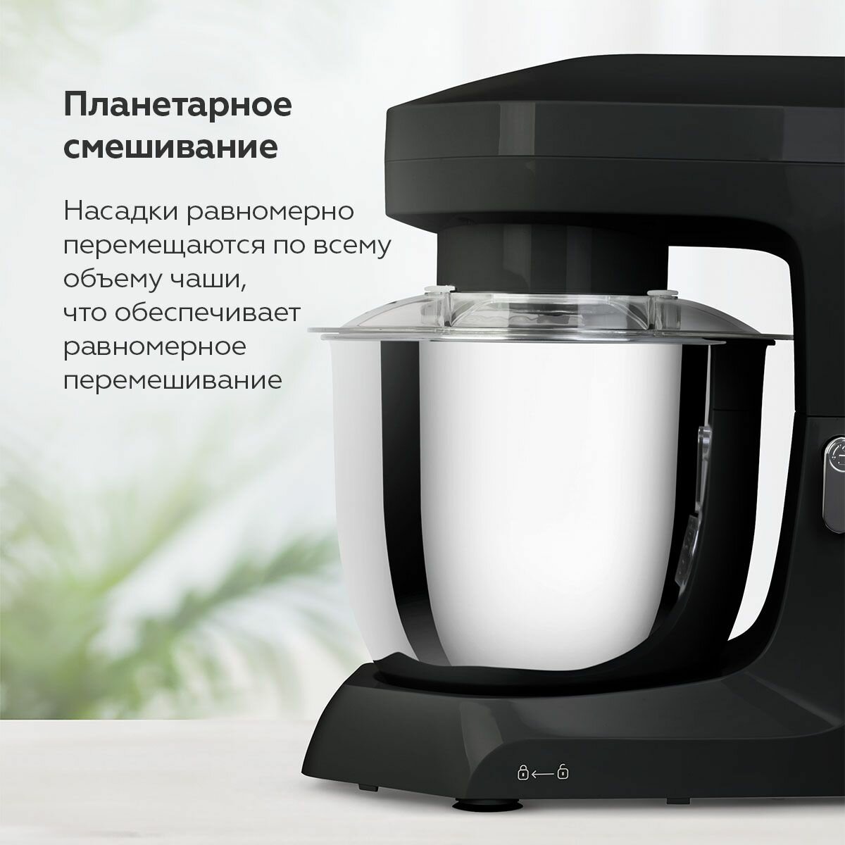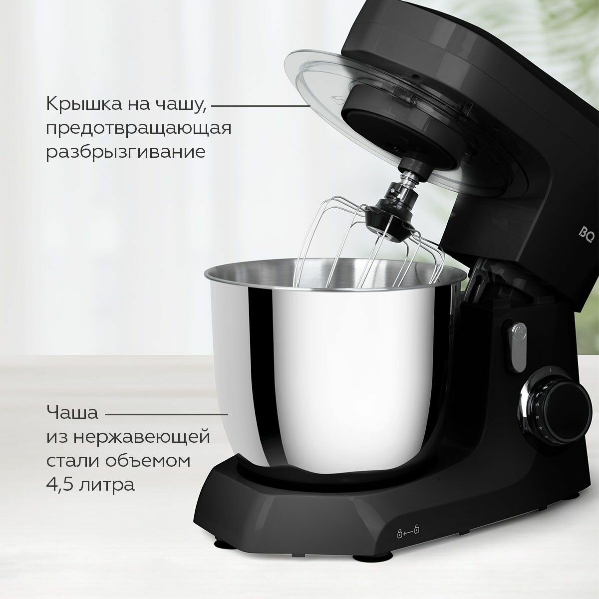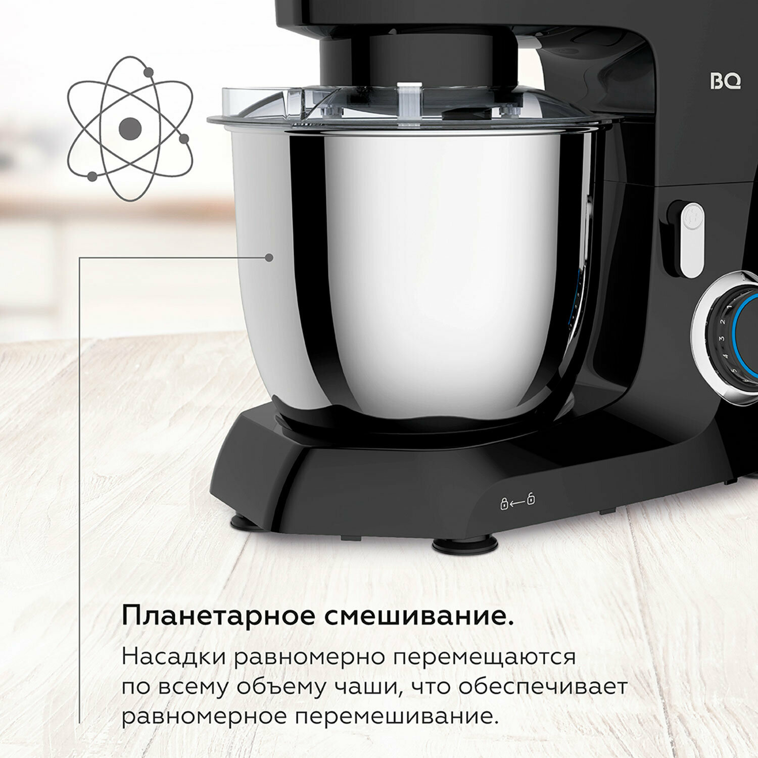 Стильный планетарный миксер BQ с максимальной мощностью 1600 Вт возьмет на себя самую сложную работу по приготовлению блюд. Прибор имеет 10 скоростных режимов + импульсный режим, которые можно выбирать по своему усмотрению. В комплект с кухонной машиной входит три насадки: для взбивания, смешивания ингредиентов и для замешивания теста. Большая чаша прибора емкостью 4,5 л изготовлена из нержавеющей стали, которая не оказывает влияния на вкус продуктов. Для особого удобства емкость имеет прозрачную крышку с отверстием, которая защищает рабочую поверхность от брызг. Кроме того, через него можно добавлять ингредиенты, не прерывая процесса работы. Одним из главных преимуществ кухонной машины является технология планетарного вращения насадок, благодаря которой они двигаются не только вокруг своей оси, но и по всей поверхности чаши. В результате консистенция крема или теста становится максимально однородной. Такой чудо-прибор отлично справляется с «тяжелым тестом», поэтому его часто используют в небольших пекарнях или домашних кондитерских. Внимание! Мытье съемных элементов миксера в посудомоечной машине не рекомендуется!Основные характеристики:Мощность - 1600 Вт,Насадки 3 шт,Объем чаши – 4,5 л,Количество скоростей - 10Импульсный режим,Плавный пуск,Длина сетевого шнура - 1 м.