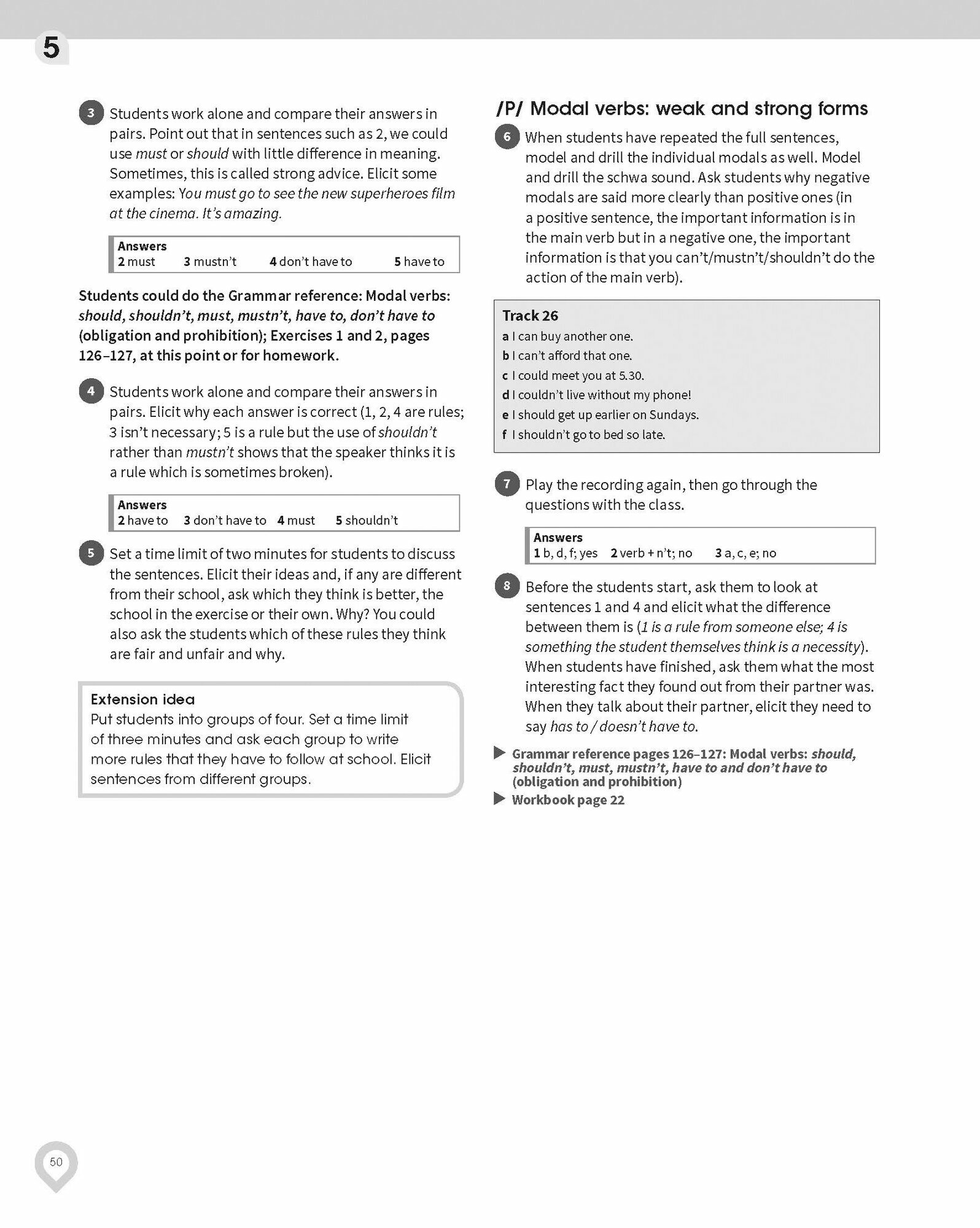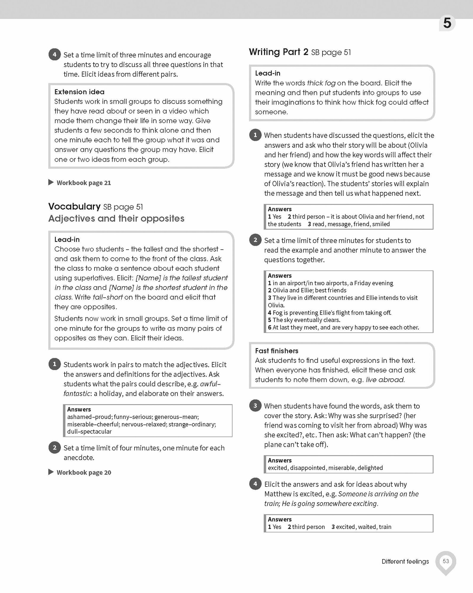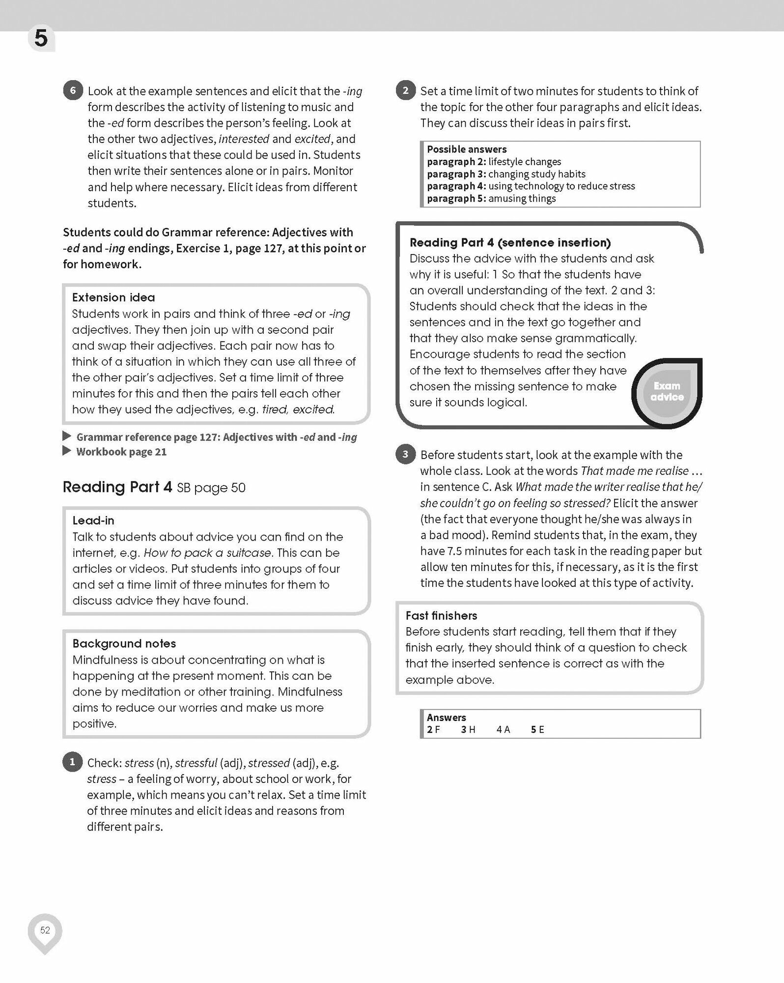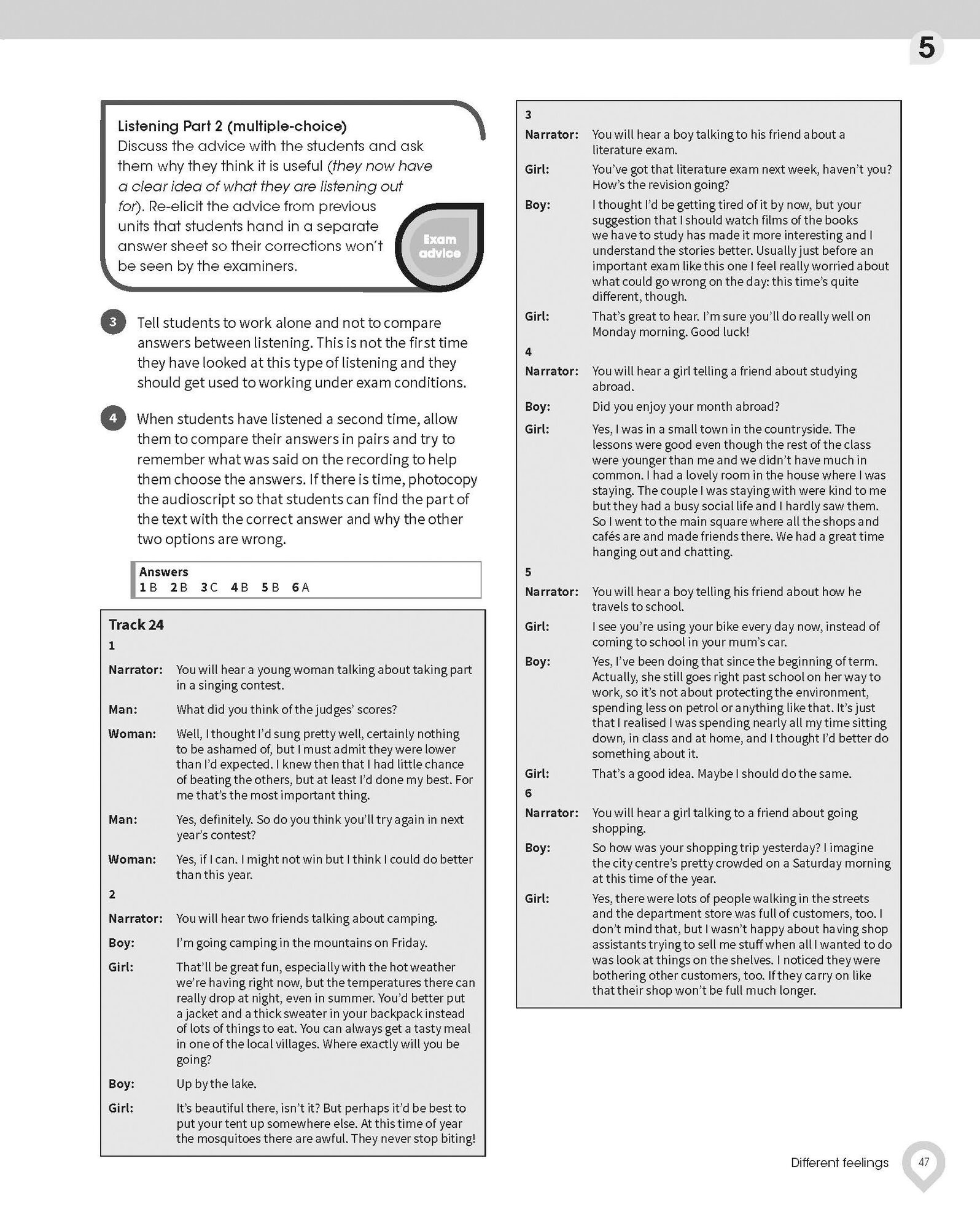 В книге для учителя даны детальные планы уроков, информация по теме, советы и дополнительные ресурсы для расширения материала урока, методические советы к каждому этапу урока, ответы к упражнениям в учебнике и рабочей тетради, а так же скрипты к аудио упражнениям. В конце каждого юнита представлены дополнительные упражнения на закрепление знаний вокабуляра. В загружаемых ресурсах представлены все необходимые аудиоматериалы для работы в классе, доступ к видеозаписям части Говорение экзамена First for Schools и дополнительные материалы на развитие навыков выполнения экзаменационных заданий. Коллекция онлайн материалов состоит из набора аудиозаписей, необходимых для работы с учебником, доступом к видеозаписям экзаменационного раздела "Говорение", дополнительные упражнения на развитие языковых навыков и стратегий выполнения экзаменационных заданий.