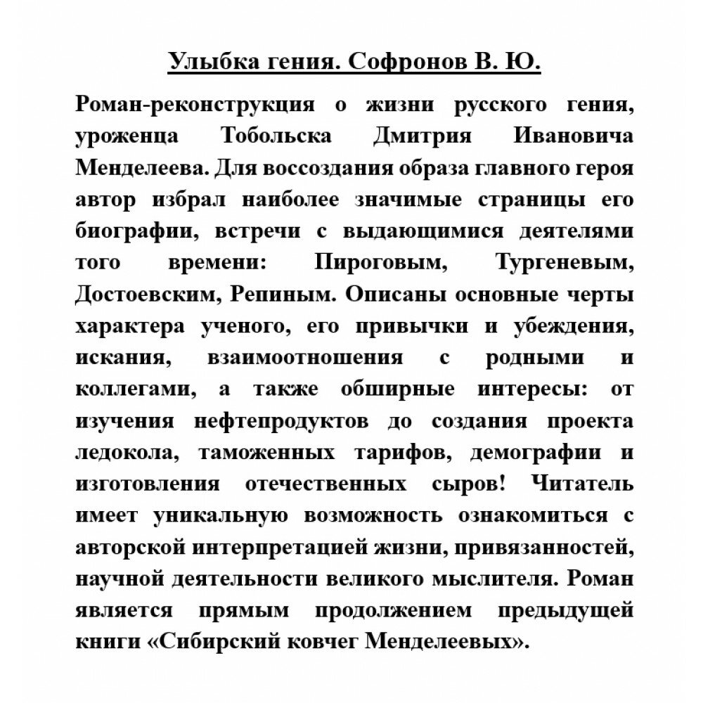 Роман-реконструкция о жизни русского гения, уроженца Тобольска Дмитрия Ивановича Менделеева. Для воссоздания образа главного героя автор избрал наиболее значимые страницы его биографии, встречи с выдающимися деятелями того времени: Пироговым, Тургеневым, Достоевским, Репиным. Описаны основные черты характера ученого, его привычки и убеждения, искания, взаимоотношения с родными и коллегами, а также обширные интересы: от изучения нефтепродуктов до создания проекта ледокола, таможенных тарифов, демографии и изготовления отечественных сыров! Читатель имеет уникальную возможность ознакомиться с авторской интерпретацией жизни, привязанностей, научной деятельности великого мыслителя. Роман является прямым продолжением предыдущей книги "Сибирский ковчег Менделеевых".