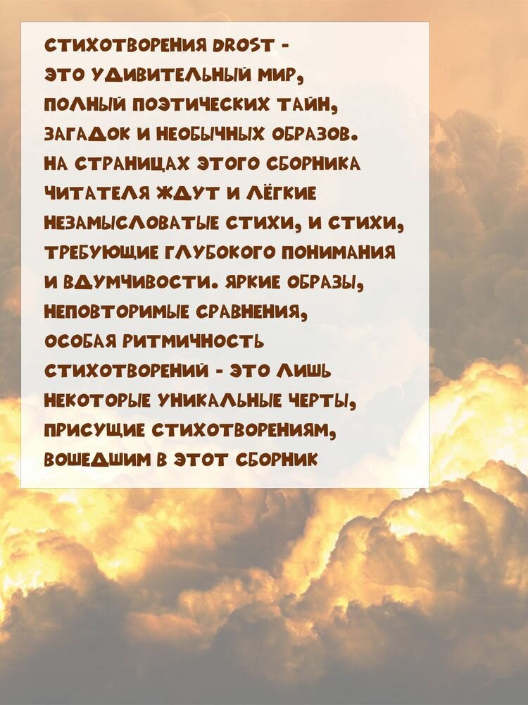 Стихотворения Drost — это удивительный мир, полный поэтических тайн, загадок и необычных образов. На страницах этого сборника читателя ждут и лёгкие незамысловатые стихи, и стихи, требующие глубокого понимания и вдумчивости. Яркие образы, неповторимые сравнения, особая ритмичность стихотворений — это лишь некоторые уникальные черты, присущие стихотворениям, вошедшим в этот сборник.