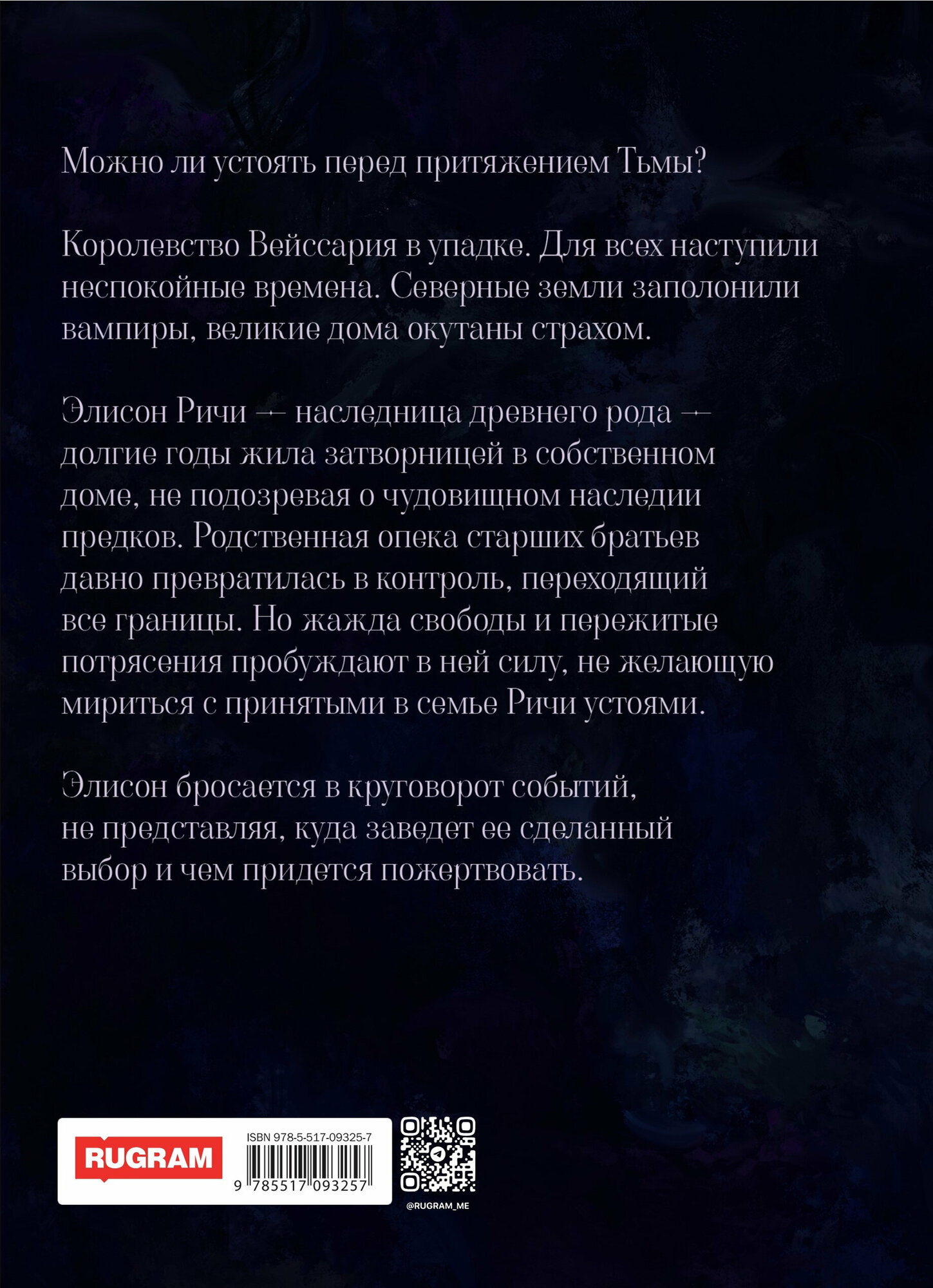 Элисон Ричи — наследница древнего рода — долгие годы жила затворницей в собственном доме, не подозревая о чудовищном наследии предков. Родственная опека старших братьев давно превратилась в контроль, переходящий все границы. Но жажда свободы и пережитые потрясения пробуждают в ней силу, не желающую мириться с принятыми в семье Ричи устоями. Элисон бросается в круговорот событий, не представляя, куда заведет ее сделанный выбор и чем придется пожертвовать.