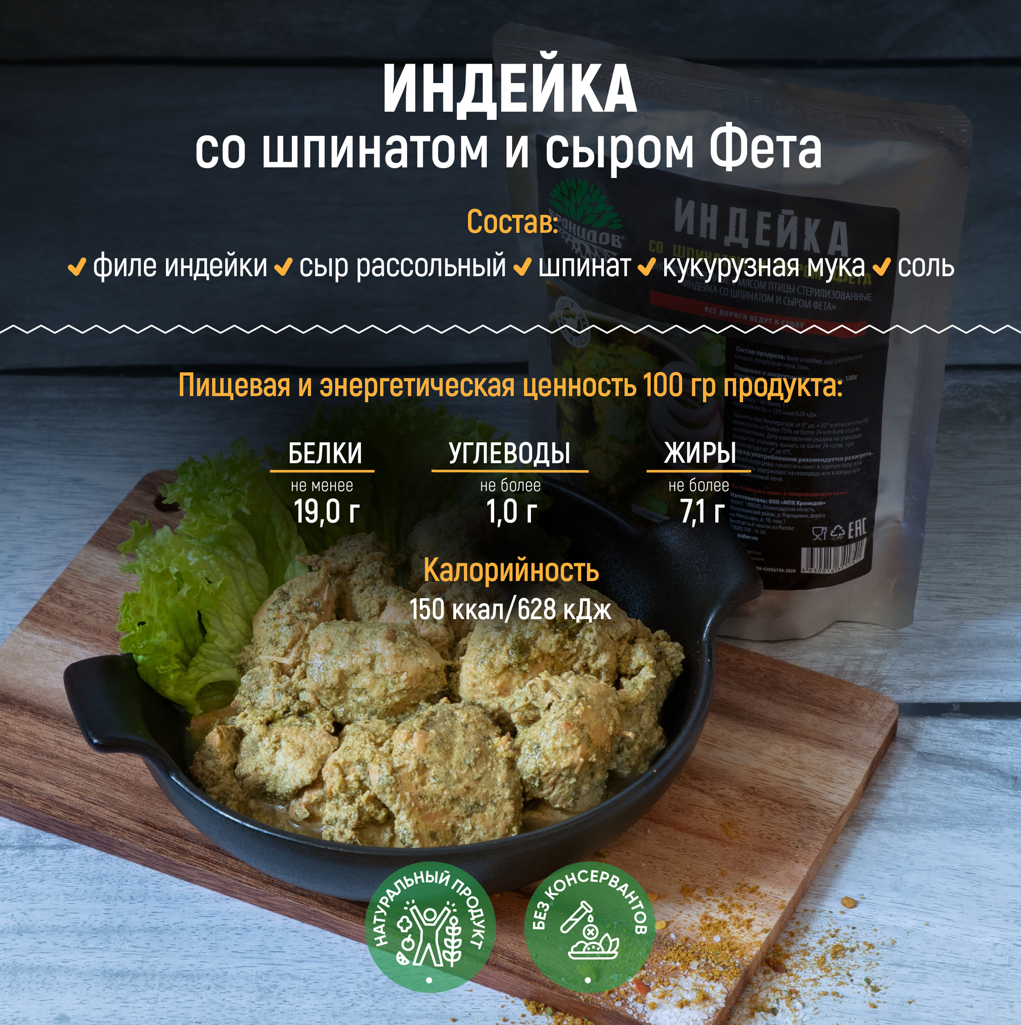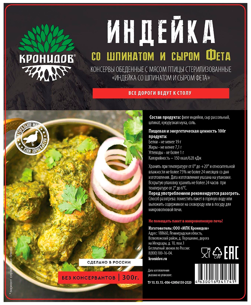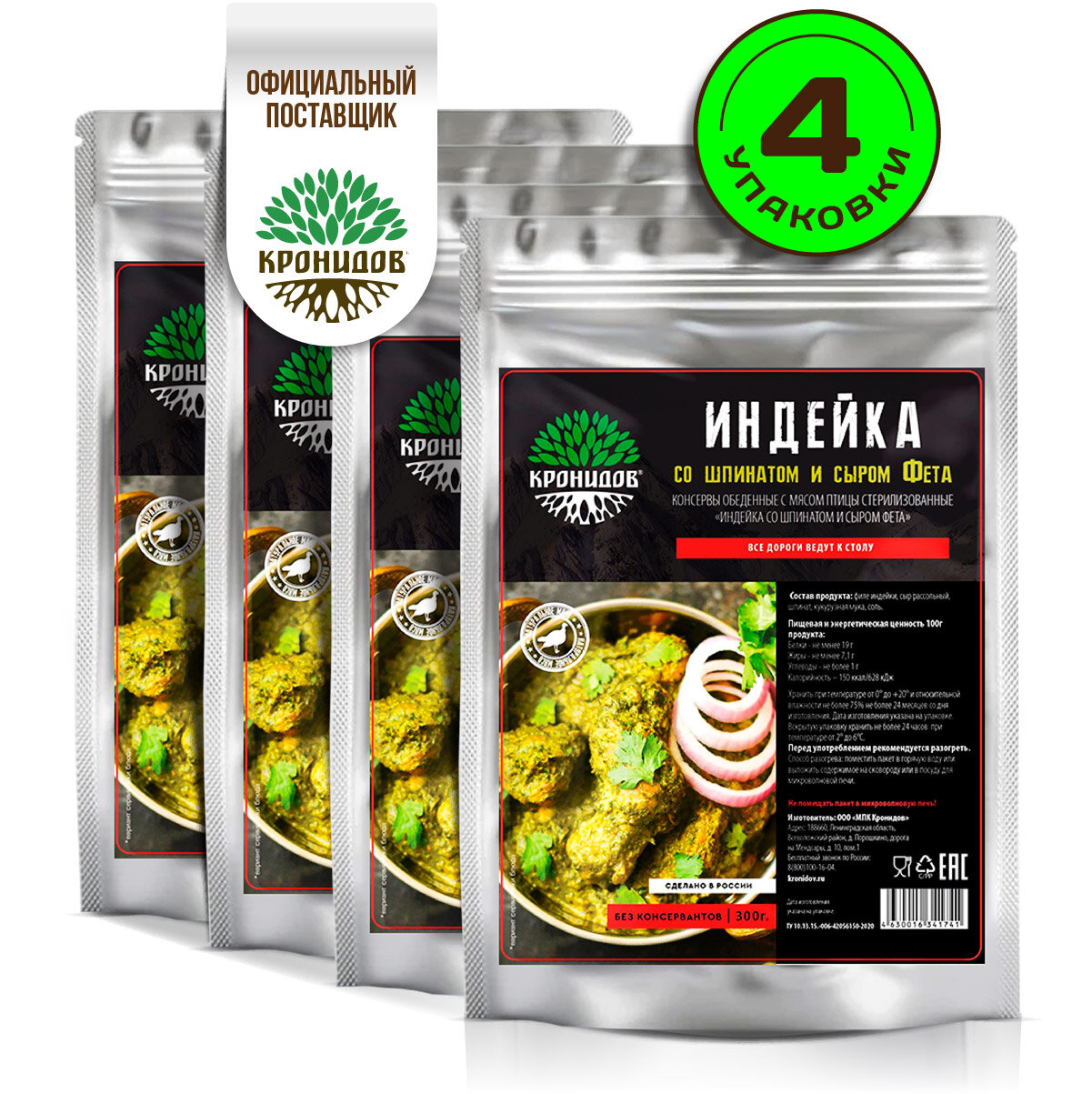 Современные Консервы Кронидов – это вкусный и полезный перекус либо полноценный обед, который можно устроить дома, на работе или на природе. Захватите с собой несколько реторт-пакетов, чтобы разделить готовую еду с друзьями. Еда в дорогу быстро утолит ваш голод и придаст сил, а отличный вкус еще долго будет напоминать о чудесном путешествии. Еда за несколько минутБлагодаря технологии приготовления вам не составит труда довести консервы Кронидов до готового состояния. Чтобы их разогреть, используйте микроволновую печь, водяную баню или беспламенные нагреватели пищи. Всего лишь через 5-10 минут обед будет готов. Еда находится в реторт-пакетах, которые продлевают срок хранения до 24 месяцев, причем даже при комнатной температуре. В состав готовых блюд входят только натуральные ингредиенты, что делает их максимально полезными. Реторт-пакеты удобны и экологичны. Благодаря их устойчивости вы с легкостью сможете есть прямо из упаковки. Для природы такие пакеты совершенно безобидны и не причинят вреда окружающей среде. Чтобы выбрать для себя или близких подходящее блюдо, познакомьтесь с ассортиментом готовой еды Кронидов. Индейка со шпинатом и сыром фетаЭто блюдо создано для тех, кто следит за своей формой. Диетическое мясо индейки органично сочетается со шпинатом и сыром фета. Полезное блюдо утолит голод и придаст сил. Взяли его на природу – разогрейте в котелке на водяной бане или с помощью беспламенного нагревателя. На все уйдет до 10 минут.