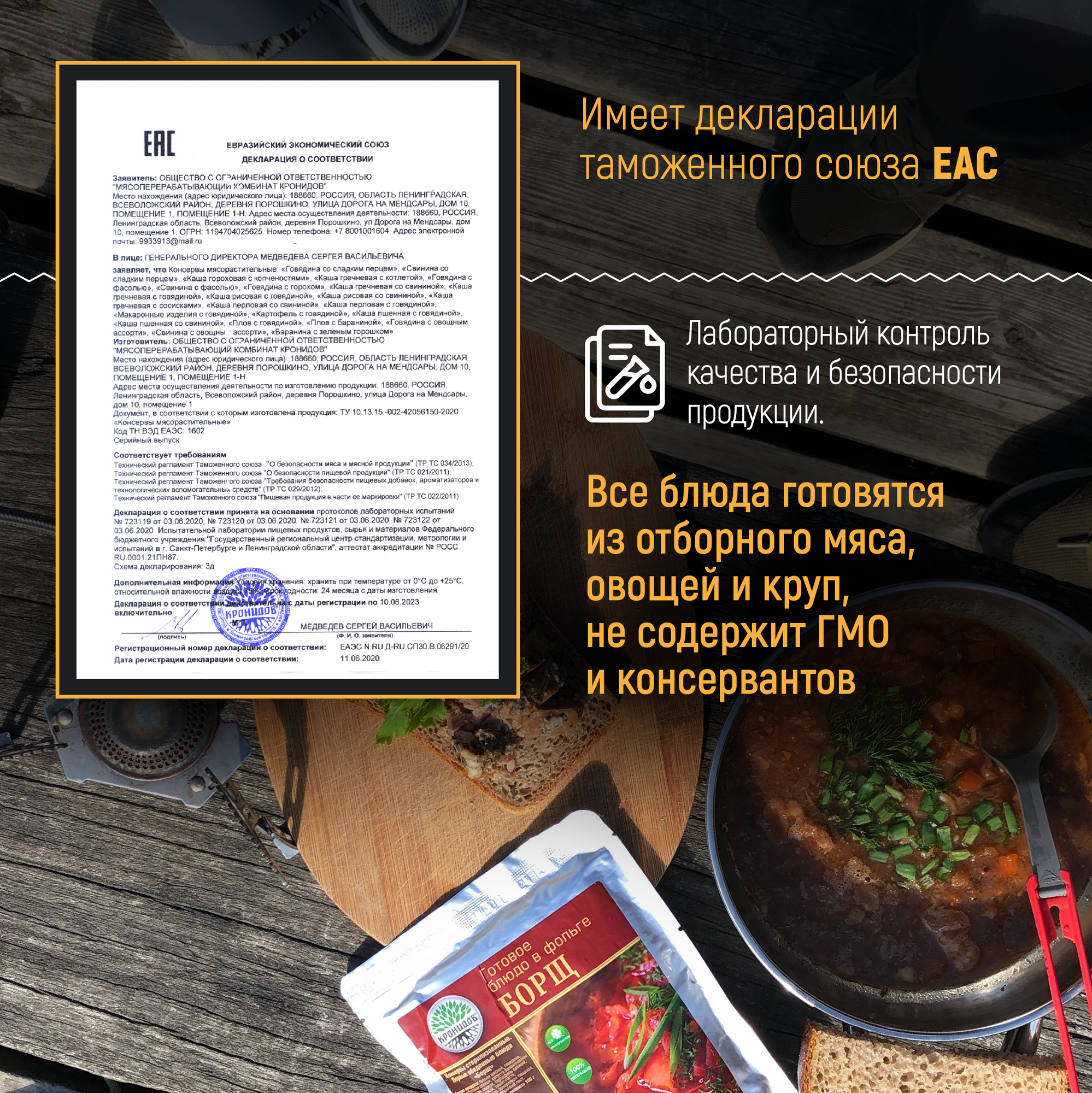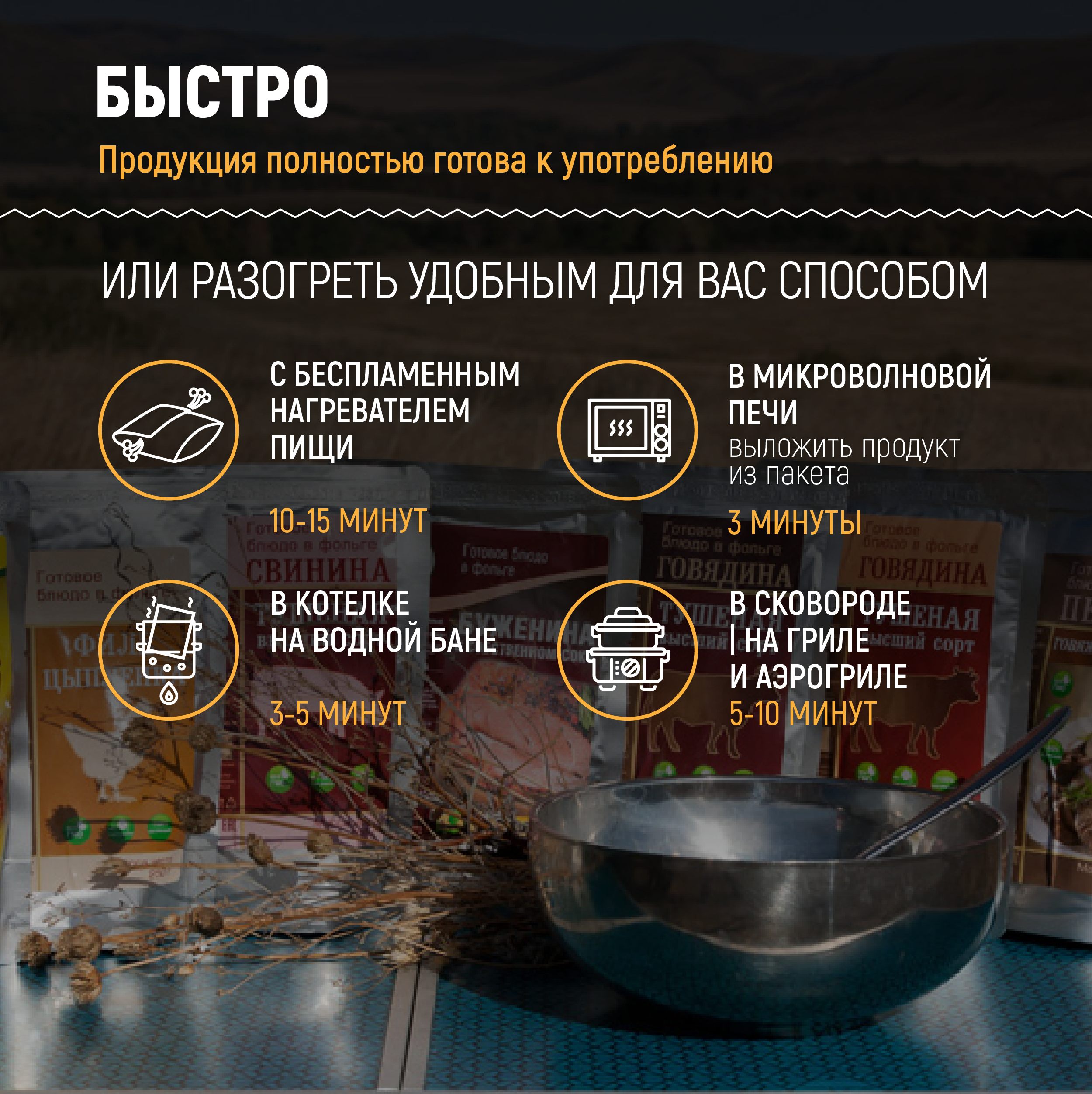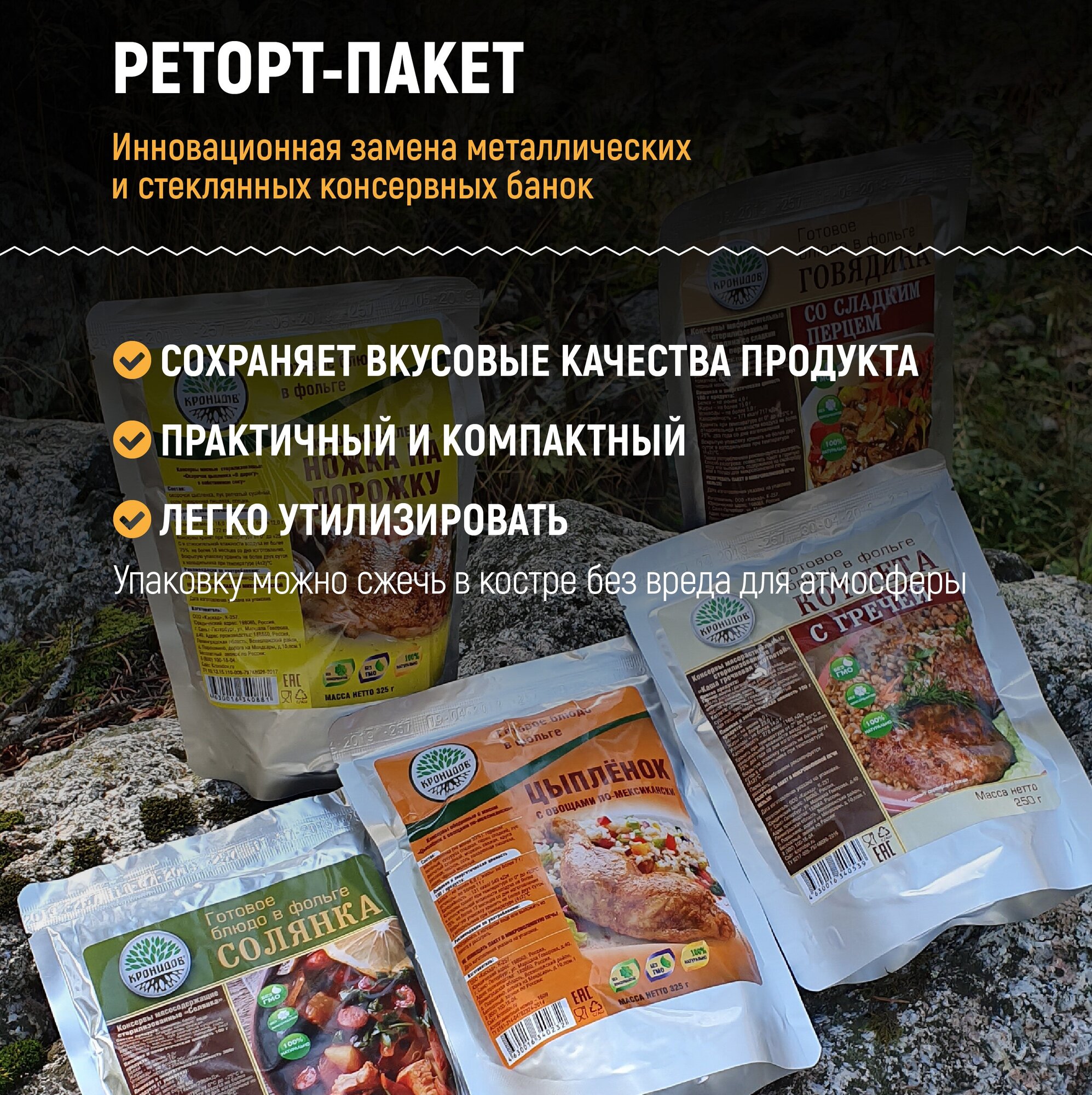 Современные Консервы Кронидов – это вкусный и полезный перекус либо полноценный обед, который можно устроить дома, на работе или на природе. Захватите с собой несколько реторт-пакетов, чтобы разделить готовую еду с друзьями. Еда в дорогу быстро утолит ваш голод и придаст сил, а отличный вкус еще долго будет напоминать о чудесном путешествии. Еда за несколько минутБлагодаря технологии приготовления вам не составит труда довести консервы Кронидов до готового состояния. Чтобы их разогреть, используйте микроволновую печь, водяную баню или беспламенные нагреватели пищи. Всего лишь через 5-10 минут обед будет готов. Еда находится в реторт-пакетах, которые продлевают срок хранения до 24 месяцев, причем даже при комнатной температуре. В состав готовых блюд входят только натуральные ингредиенты, что делает их максимально полезными. Реторт-пакеты удобны и экологичны. Благодаря их устойчивости вы с легкостью сможете есть прямо из упаковки. Для природы такие пакеты совершенно безобидны и не причинят вреда окружающей среде. Чтобы выбрать для себя или близких подходящее блюдо, познакомьтесь с ассортиментом готовой еды Кронидов. Индейка со шпинатом и сыром фетаЭто блюдо создано для тех, кто следит за своей формой. Диетическое мясо индейки органично сочетается со шпинатом и сыром фета. Полезное блюдо утолит голод и придаст сил. Взяли его на природу – разогрейте в котелке на водяной бане или с помощью беспламенного нагревателя. На все уйдет до 10 минут.