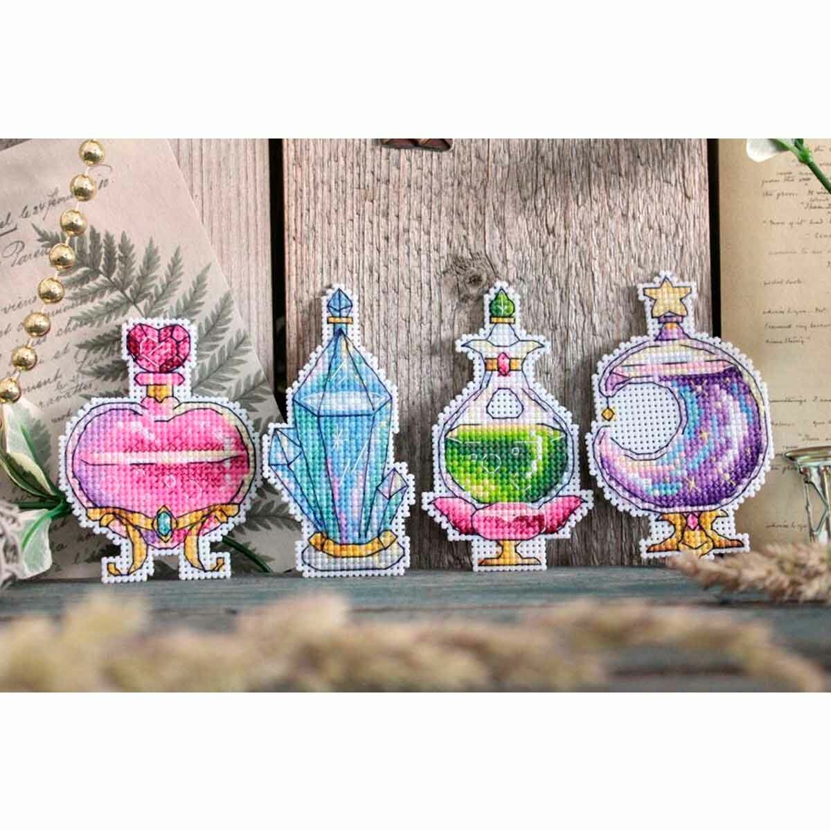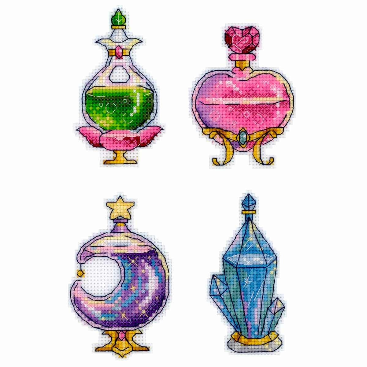 Вышитые магниты на пластиковой канве – это оригинальные сувениры и превосходный подарок. Магниты 'Зелья' украсят дверцу холодильника и любую металлическую поверность. Чтобы сделать такой сувенир, достаточно владеть техникой 'крест'. Пяльцы или рамки не понадобятся – пластиковая канва отлично держит форму. Готовые элементы надо вырезать по контуру. К оборотной стороне фиксируется фиксируется магнитное полотно. В наборе: пластиковая канва, хлопковое мулине ПНК им. Кирова, фетр, магнитное полотно, игла, двухцветная схема, инструкция. Количество цветов: 26. Размер готового сувенира: 6х9 см.