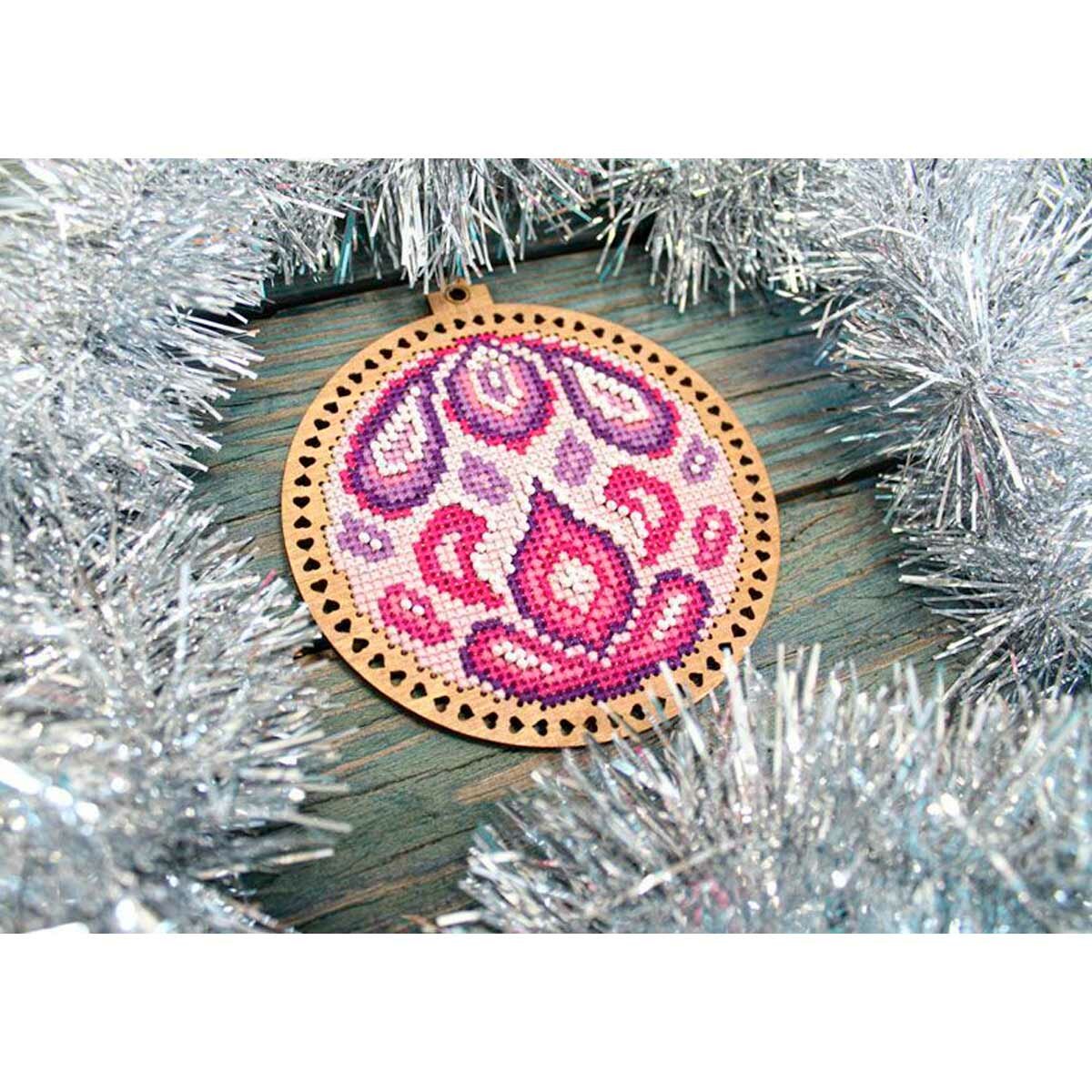 | Комплектация | перфорированная деревянная основа; бисер Preciosa; швейные нити; белый фетр для обработки задника; лента; цветная символьная схема; игла; инструкция |