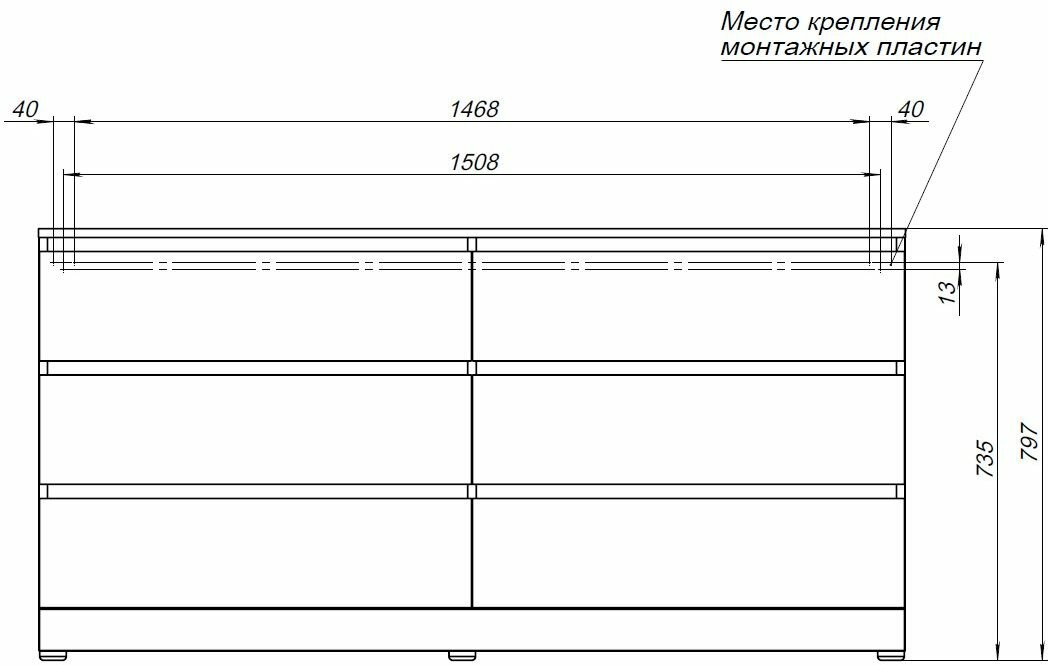 | Дополнительная информация | Ножки скрытые с возможностью регулировки до 15 мм. Интегрированная ручка - фрезеровка 45 град. Выдвижные ящики установлены на направляющие скрытого монтажа. Демпфер на корпусе комода. |
