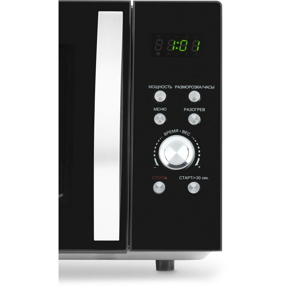 На передней панели прибора присутствует шесть кнопок, один поворотный регулятор для варьирования времени и веса, а также яркий жидкокристаллический дисплей. Управление и настройка режимов работы устройства выполняются с помощью верхних четырех клавиш. Они позволяют быстро подстроить девайс под определенный продукт. Благодаря максимальной мощности в 800 Вт микроволновка может как быстро разогреть, так и бережно и постепенно разморозить. При этом, и разморозка, и разогрев, и даже приготовление могут происходить на автоматике. Две нижние кнопки отвечают за быстрый старт (плюс 30 секунд времени) и остановку.