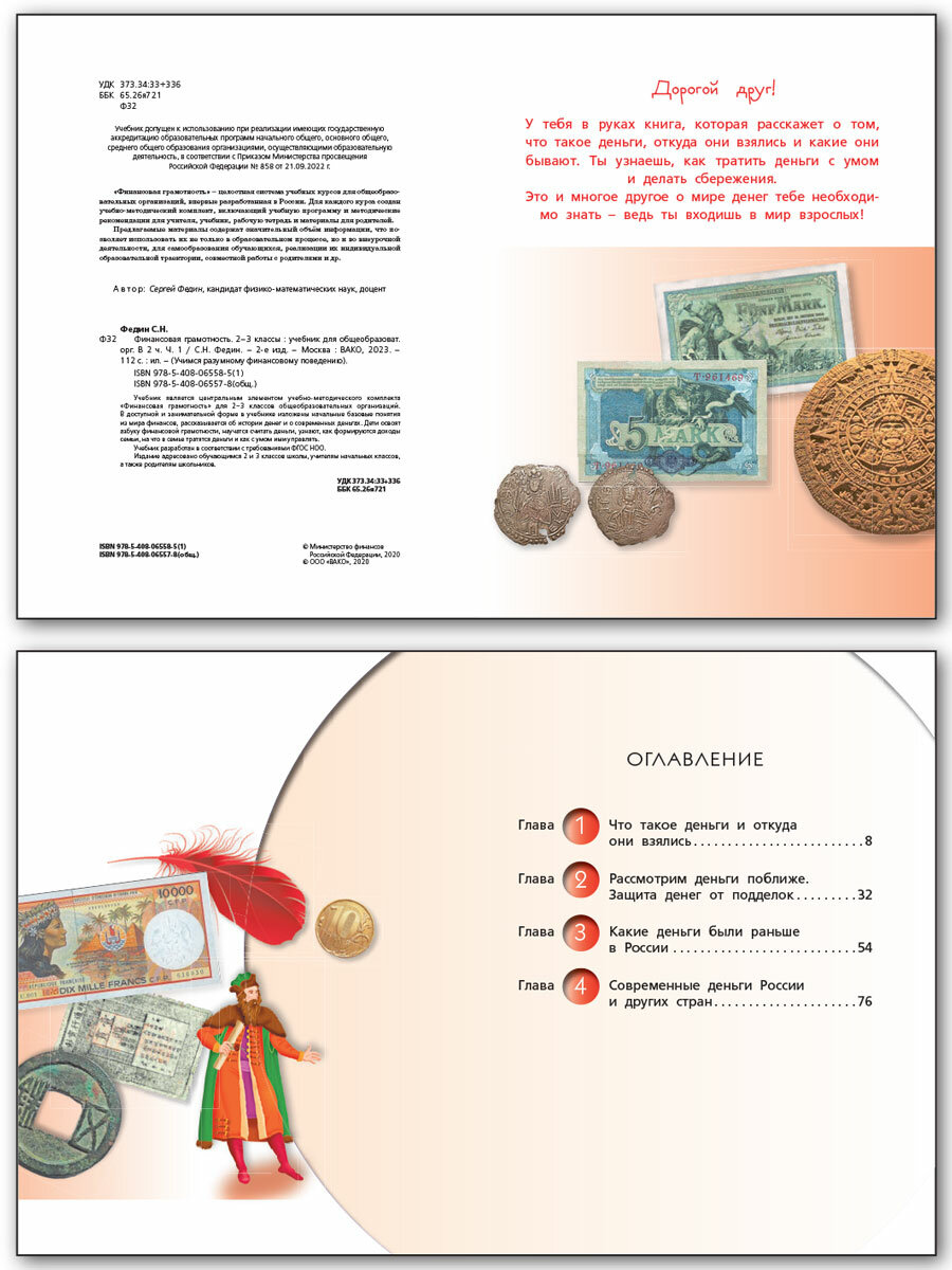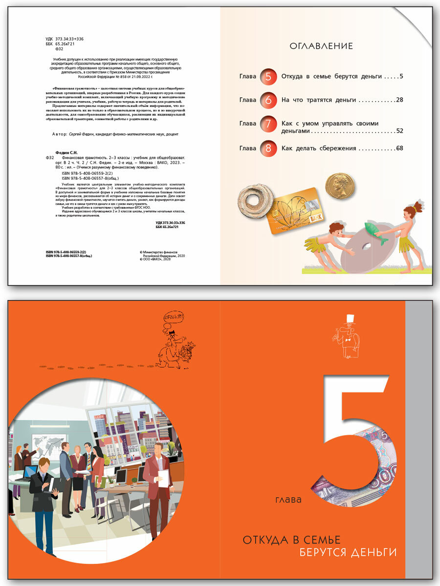 Учебник является центральным элементом учебно-методического комплекта «Финансовая грамотность» для 2–3 классов общеобразовательных организаций. В доступной и занимательной форме в учебнике изложены начальные базовые понятия из мира финансов, рассказывается об истории денег и о современных деньгах. Дети освоят азбуку финансовой грамотности, научатся считать деньги, узнают, как формируются доходы семьи, на что в семье тратятся деньги и как с умом ими управлять.