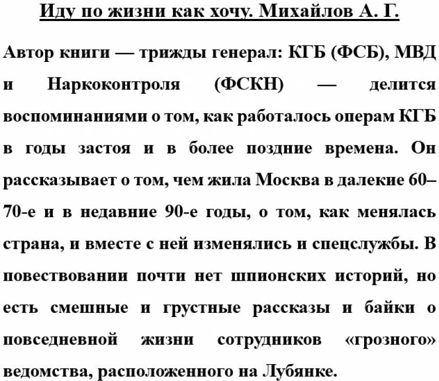 Автор книги - трижды генерал: КГБ (ФСБ), МВД и Наркоконтроля (ФСКН) - делится воспоминаниями о том, как работалось операм КГБ в годы застоя и в более поздние времена. Он рассказывает о том, чем жила Москва в далекие 60-70-е и в недавние 90-е годы, о том, как менялась страна и вместе с ней изменялись и спецслужбы. В повествовании почти нет шпионских историй, но есть смешные и грустные рассказы и байки о повседневной жизни сотрудников "грозного" ведомства, расположенного на Лубянке.