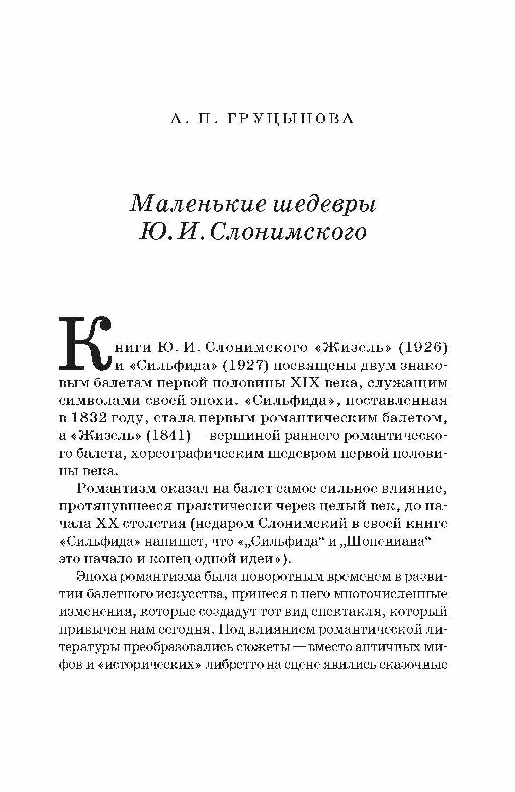 В сборник вошли ранние книги Ю. И. Слонимского «Сильфида» и «Жизель», представляющие собой комплексные труды высочайшего научного уровня. Широта охвата материала, глубокое знание предмета анализа и вместе с тем искренняя любовь к изучаемым сочинениям делают их маленькими шедеврами научно-исследовательской мысли.