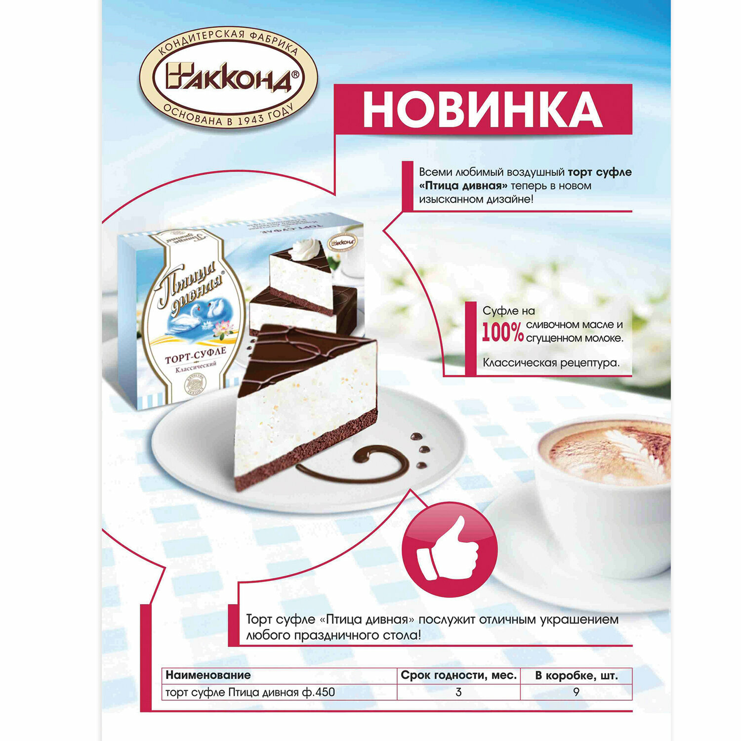 Сервис сравнения цен СкидкаГИД предлагает сравнить цены на товар «Торт-суфле Акконд Птица дивная 450г АО Акконд»
