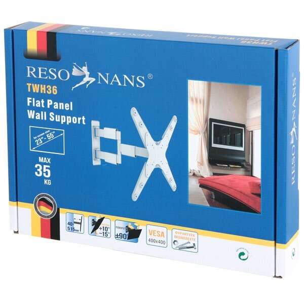 Наклонно-поворотный кронштейн для ТВ Resonans прекрасно подойдет для надежного закрепления на стене широкоформатного телевизора. Белый цвет позволит монтировать аксессуар на светлых поверхностях, позволяя идеально вписаться в интерьер помещения и стать его неотъемлемой частью.Преимущества моделиКронштейн оснащен шарнирным механизмом, благодаря которым можно с легкостью и без всяких усилий перемещать закрепленный телевизор в горизонтальной и вертикальной плоскости. Аксессуар позволяет перемещать закрепленное устройство на 45 градусов влево и вправо, на 10 градусов вверх и на 15 – вниз. Модель обладает целым рядом достоинств, среди которых можно отметить следующие:аксессуар способен выдерживать постоянную нагрузку до 35 кг;декоративные насадки, идущие в комплекте, надежно скроют точку крепления, закончив эстетический вид;использование высококачественного металла, способного выдерживать большие нагрузки.Кронштейн Resonans подойдет для современных моделей телевизоров с диагональю в пределах от 23 до 55 дюймов. Крепкий и надежный, он станет замечательным приобретением, не требующим дополнительного ухода и легкого в установке.