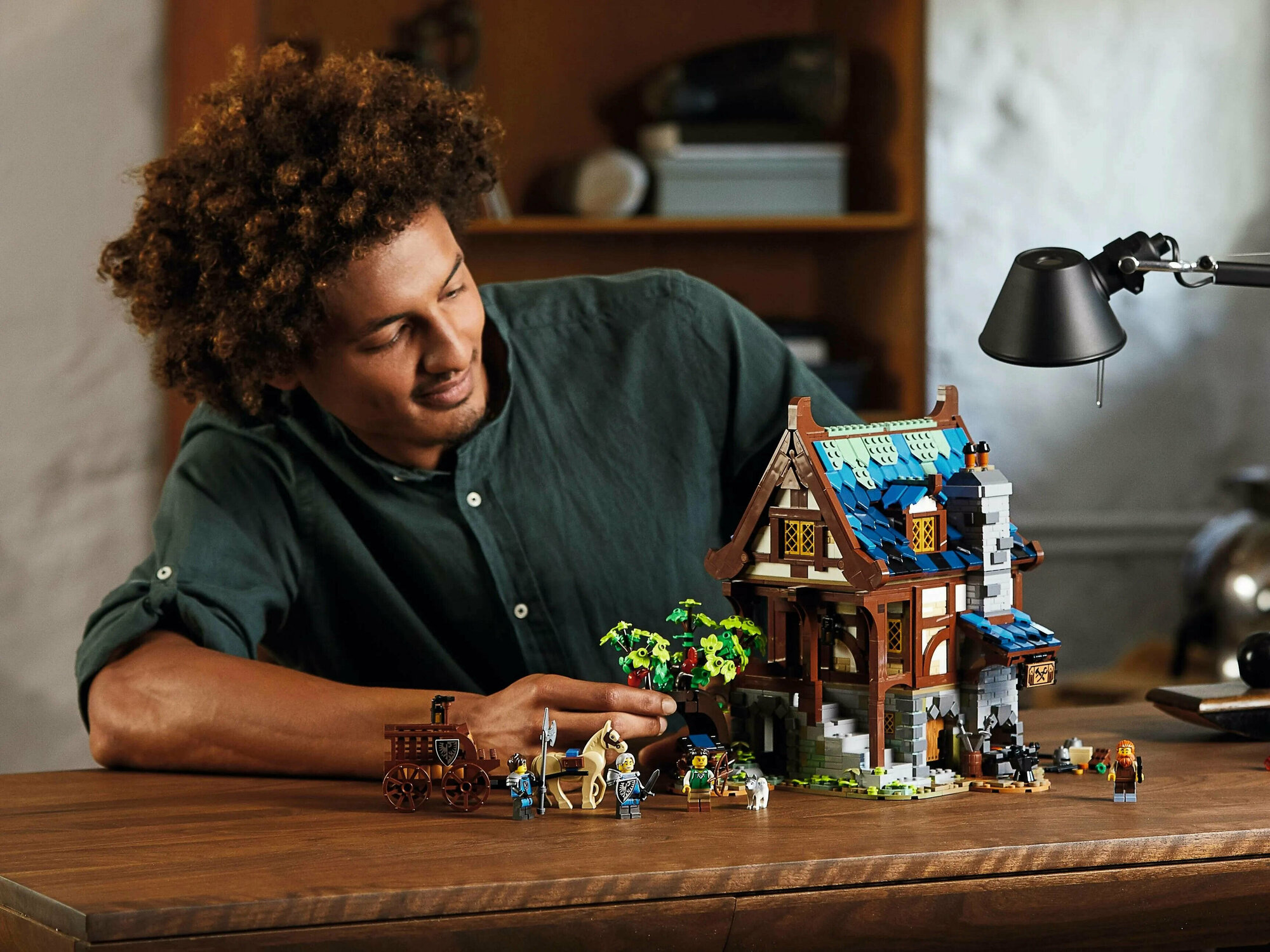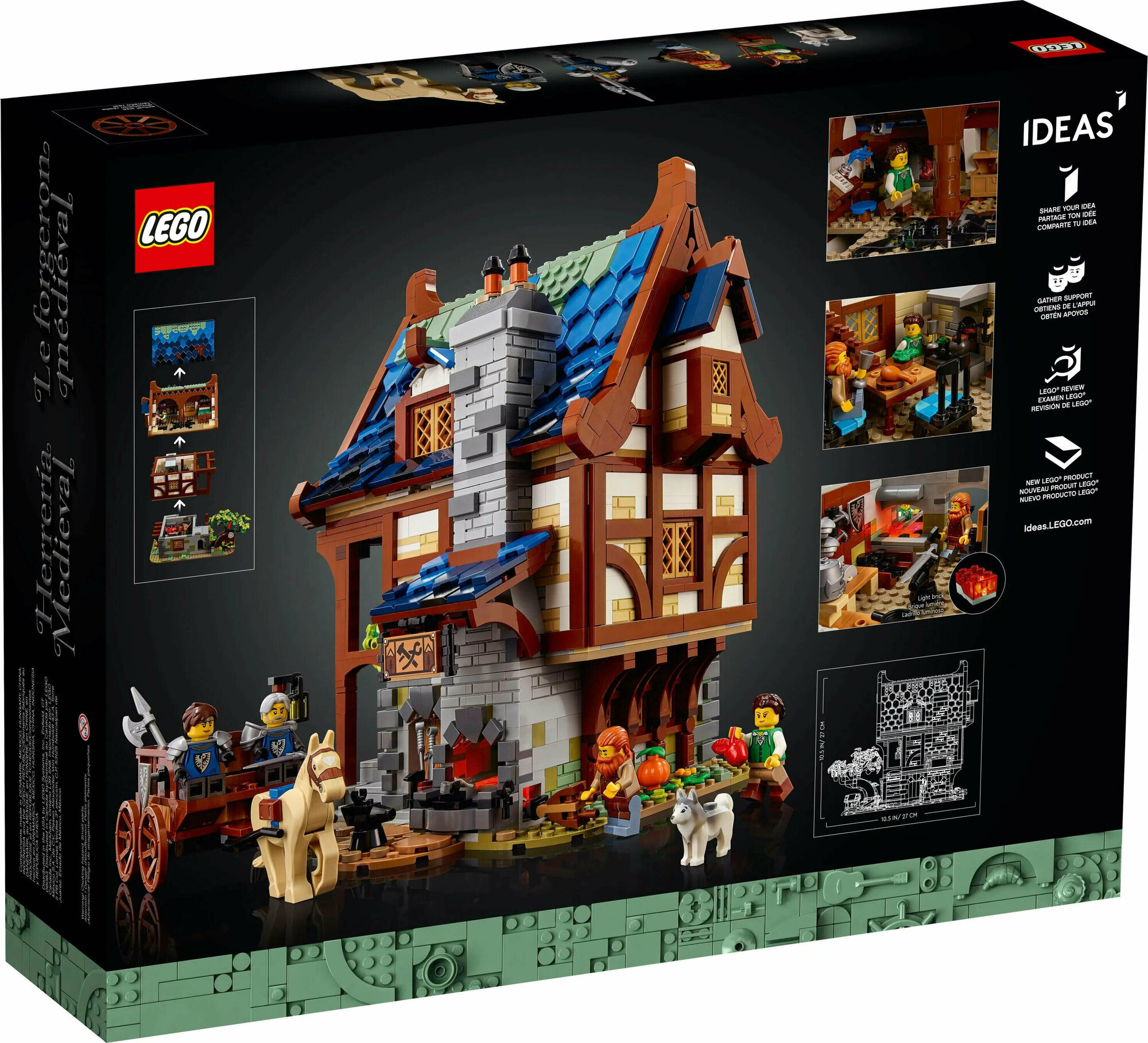 Отправьтесь в путешествие назад во времени с этой удивительной моделью рабочего места и дома средневекового кузнеца LEGO. Рассмотрите множество реалистичных деталей и уникальных элементов внутри трехэтажного здания: от кухни и спальни в средневековом стиле до полностью оборудованной кузницы. Нажмите на меха, чтобы засветился горн, и осмотрите сад, где растет корявая яблоня и находится колодец, мишень для лучников и лошадь с телегой. Познакомьтесь с архитектурными деталями средневековой кузницы и дома, отдохните от современной жизни и соберите эту зрелищную модель LEGO Ideas (21325)