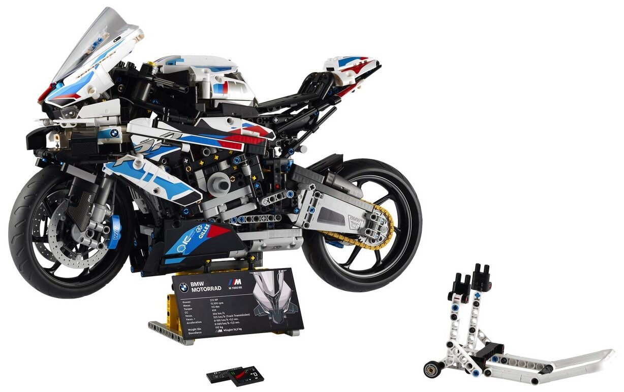 Разработанный для спортивных гонок и усовершенствованный для дорог мотоцикл BMW M 1000 RR покорил сердца поклонников авто- и мотоспорта. Теперь вы можете насладиться захватывающей сборкой и создать собственную версию этого превосходного мотоцикла — модель LEGO Technic (42130). Чистая мощь. Погрузитесь в богатство деталей этой впечатляющей модели мотоцикла. Впервые во вселенной LEGO Technic используется масштаб 1:5. Благодаря реалистичным характеристикам модель выглядит и движется как настоящая. Изучите функциональную трехступенчатую (+ нейтраль) коробку передач, рулевое управление, переднюю и заднюю подвески, цепную передачу и рядный четырехпоршневый двигатель. Модель мотоцикла в знаменитой раскраске BMW выглядит крайне стильно в интерьере, и в наборе есть 2 подставки для демонстрации. Управляйте своим желанием. Набор LEGO Technic BMW M 1000 RR входит в коллекцию конструкторов LEGO для взрослых. Эти наборы для сборки для взрослых отдают дань уважения самым знаменитым образцам техники в мире и предлагают познакомиться с этими машинами за расслабляющим строительством.