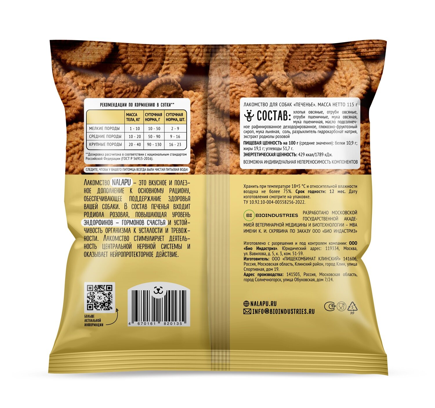 Лакомство "для счастья" от NALAPU, печенье для дрессировки и поощрений.Печенье для собак с родиолой розовой, которая повышает уровень эндорфинов, гормонов счастья, а также стимулирует деятельность центральной нервной системы. Это лакомство является хорошим дополнением к основному рациону вашего питомца, обеспечивая поддержание его здоровья.Особенность этого печенья заключается в его мультивитаминном составе, который обеспечивает благоприятное влияние на физиологические процессы и обмен веществ. Оно гипоаллергенное и подходит для всех пород собак, включая мелкие, средние и крупные.Наш товар предназначен для поощрения и повышения энергии питомца. Он также может использоваться для поддержания иммунитета и дрессировки.Его энергетическая ценность составляет 429 кКал на 100 грамм.Упаковка состоит из одного флоу-пака, в котором находится один продукт весом 115 грамм. Вы можете использовать его для дрессировки или поощрения вашего питомца.NALAPU - это известный бренд, который уже давно зарекомендовал себя на рынке лакомств для собак. Мы гарантируем качество нашей продукции и надеемся, что она станет любимым лакомством для вашего питомца!