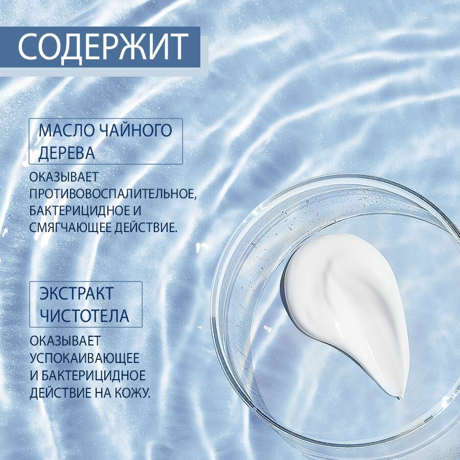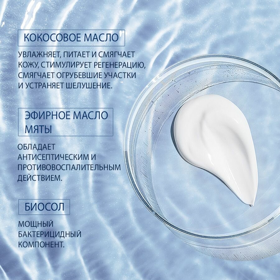 Крем с подтвержденной активностью против увеличения роста бактерий. Предотвращает появление специфического запаха при потоотделении. Антибактериальное действие проверено лабораторными испытаниями ЦКК ОНЦ. Масло чайного дерева обладает широким спектром антимикробной активности, экстракт чистотела и эфирное масло мяты оказывают успокаивающее, регенерирующее и бактерицидное действие. Кокосовое масло способствует сохранению эластичности кожи. Крем быстро впитывается. Продукт клинически протестирован.
