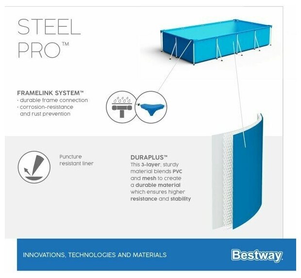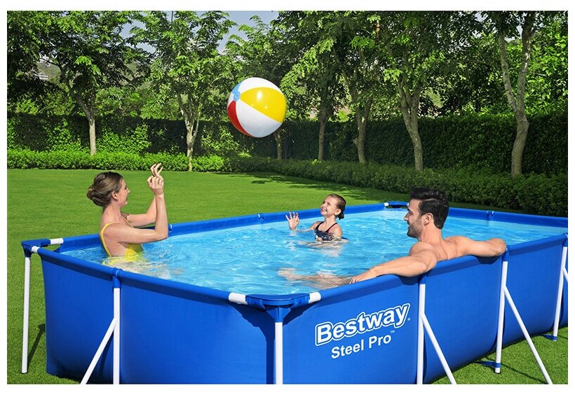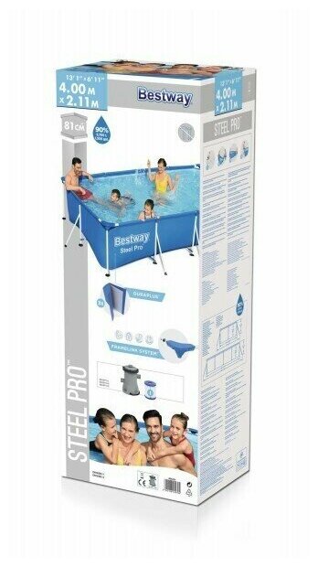 Прямоугольный каркасный бассейн Bestway. Прочный и устойчивый, с чашей из высококачественного трехслойного ПВХ. Цвет синий. Каркас металлический нержавеющий оцинкованный. Устанавливается на поверхности, без погружения в грунт. Удобный сливной клапан позволяет присоединить садовый шланг, что дает возможность слить воду в любое место. Подключение фильтровальной системы (Ø 32 мм) Размер: 400 х 211 х 81 см. Максимальные монтажные размеры: 466 x 276 см. Объем при 90% заполнении бассейна: 5700 литров. Вес упаковки: 33.64 кг. Объем упаковки (м³):0.117 .Комплектация: бассейн, DVD диск с инструкцией; насос с фильтром # 58381 1249 л / ч, картридж фильтра # 58093 Gr. I (8,0 х 9,0 см), самоклеящаяся заплатка для ремонта (характеристики и комплектация могут быть изменены производителем без предварительного уведомления) .