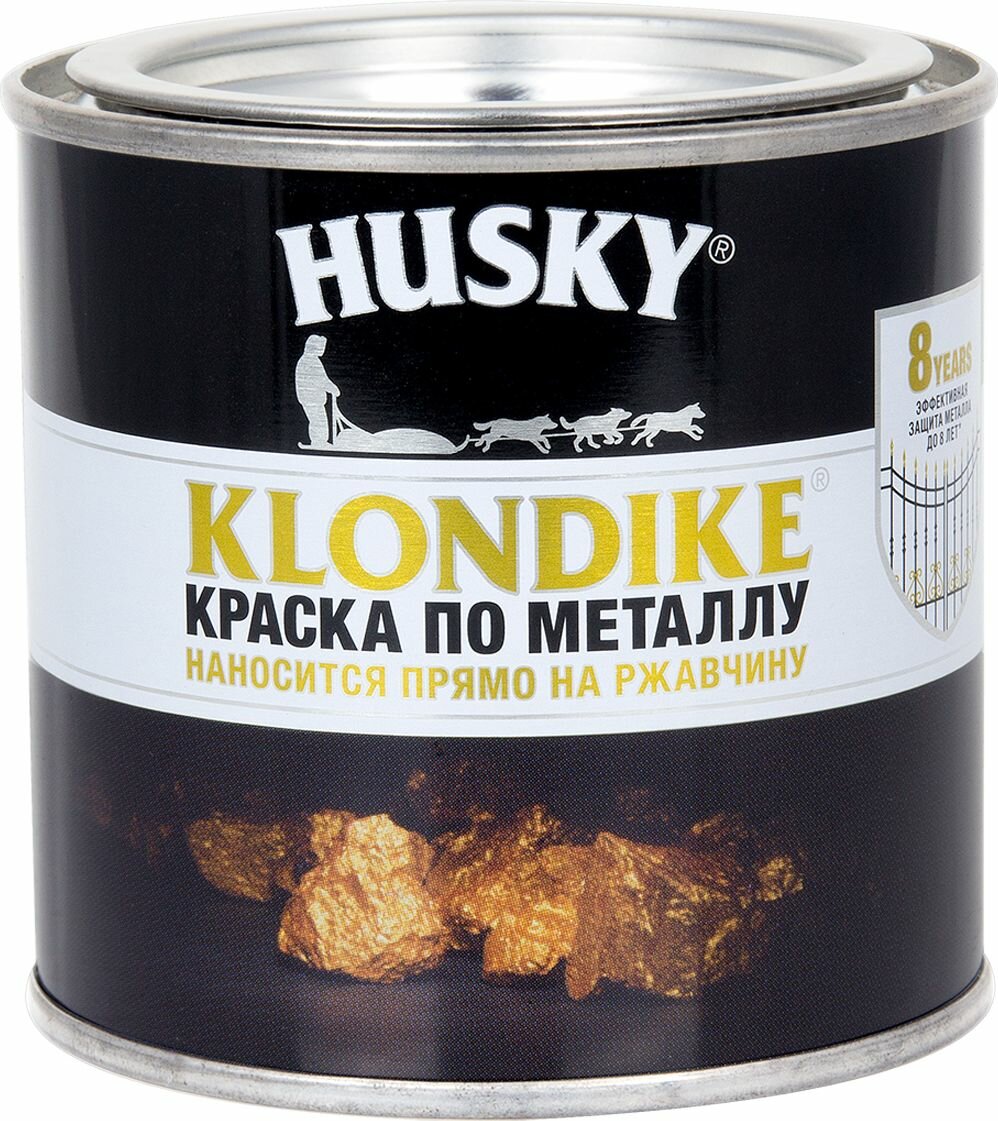 **Краска Husky Klondike** - состав, образующий глянцевое светло-желтое покрытие (RAL 1018), который включает в себя следующие компоненты: полимерное связующее, дезодорированный растворитель, антикоррозионные пигменты, ингибитор коррозии и добавки. Идеально подходит для покрытия металлических поверхностей - как внутри, так и снаружи помещения. После предварительного удаления рыхлой ржавчины краску такого типа можно наносить на прокорродировавшееся основание. Продукция выступает средством 3 в 1, так как содержит грунтовку, преобразователь ржавчины и финишное покрытие. Перед применением необходимо убедиться в том, что поверхность чистая, сухая и обезжиренная. Если есть рыхлая ржавчины, окалина и старое лакокрасочное покрытие, то их нужно тщательно удалить. Наносить рекомендуется в два слоя. Перед использованием тщательно перемешать - разбавлять продукт не требуется. Проводить работы при температуре от +5°C до +30°C.