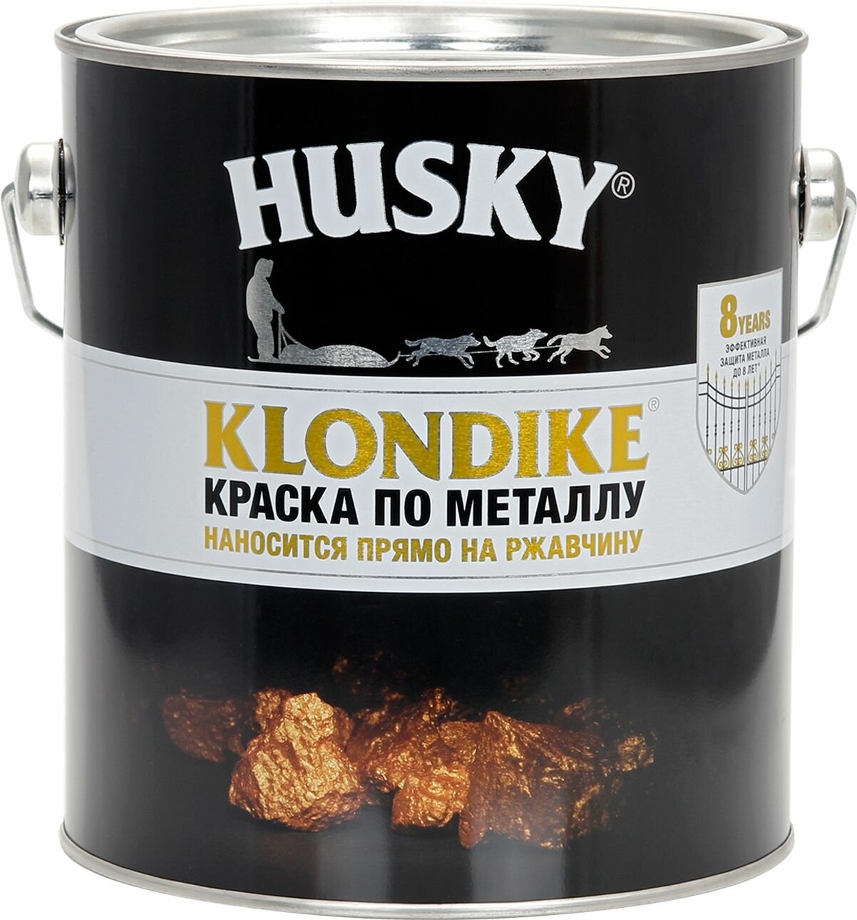 **Краска Husky Klondike** - состав, образующий глянцевое серебристое покрытие (RAL 9023), который включает в себя следующие компоненты: полимерное связующее, дезодорированный растворитель, антикоррозионные пигменты, ингибитор коррозии и добавки. Идеально подходит для покрытия металлических поверхностей - как внутри, так и снаружи помещения. После предварительного удаления рыхлой ржавчины краску такого типа можно наносить на прокорродировавшееся основание. Продукция выступает средством 3 в 1, так как содержит грунтовку, преобразователь ржавчины и финишное покрытие. Перед применением необходимо убедиться в том, что поверхность чистая, сухая и обезжиренная. Если есть рыхлая ржавчины, окалина и старое лакокрасочное покрытие, то их нужно тщательно удалить. Наносить рекомендуется в два слоя. Перед использованием тщательно перемешать - разбавлять продукт не требуется. Проводить работы при температуре от +5°C до +30°C.