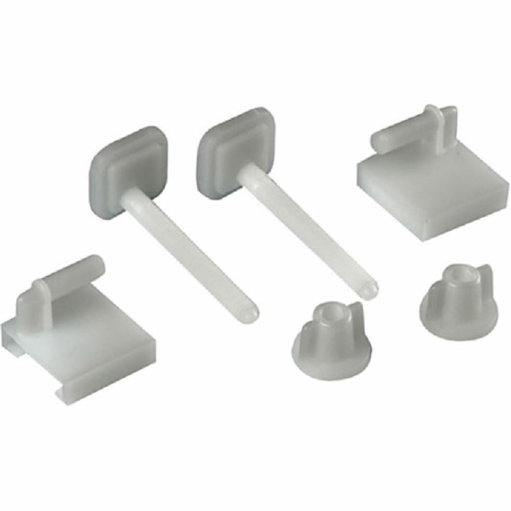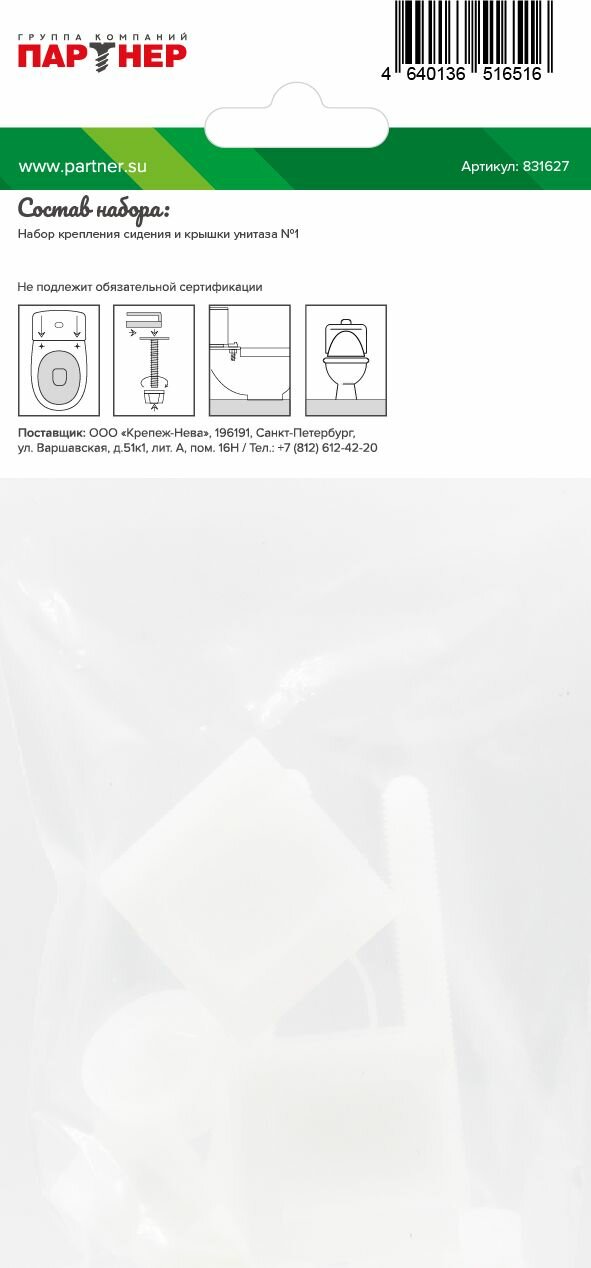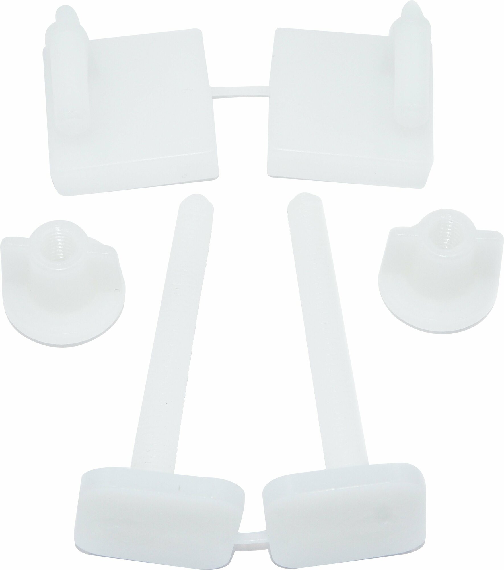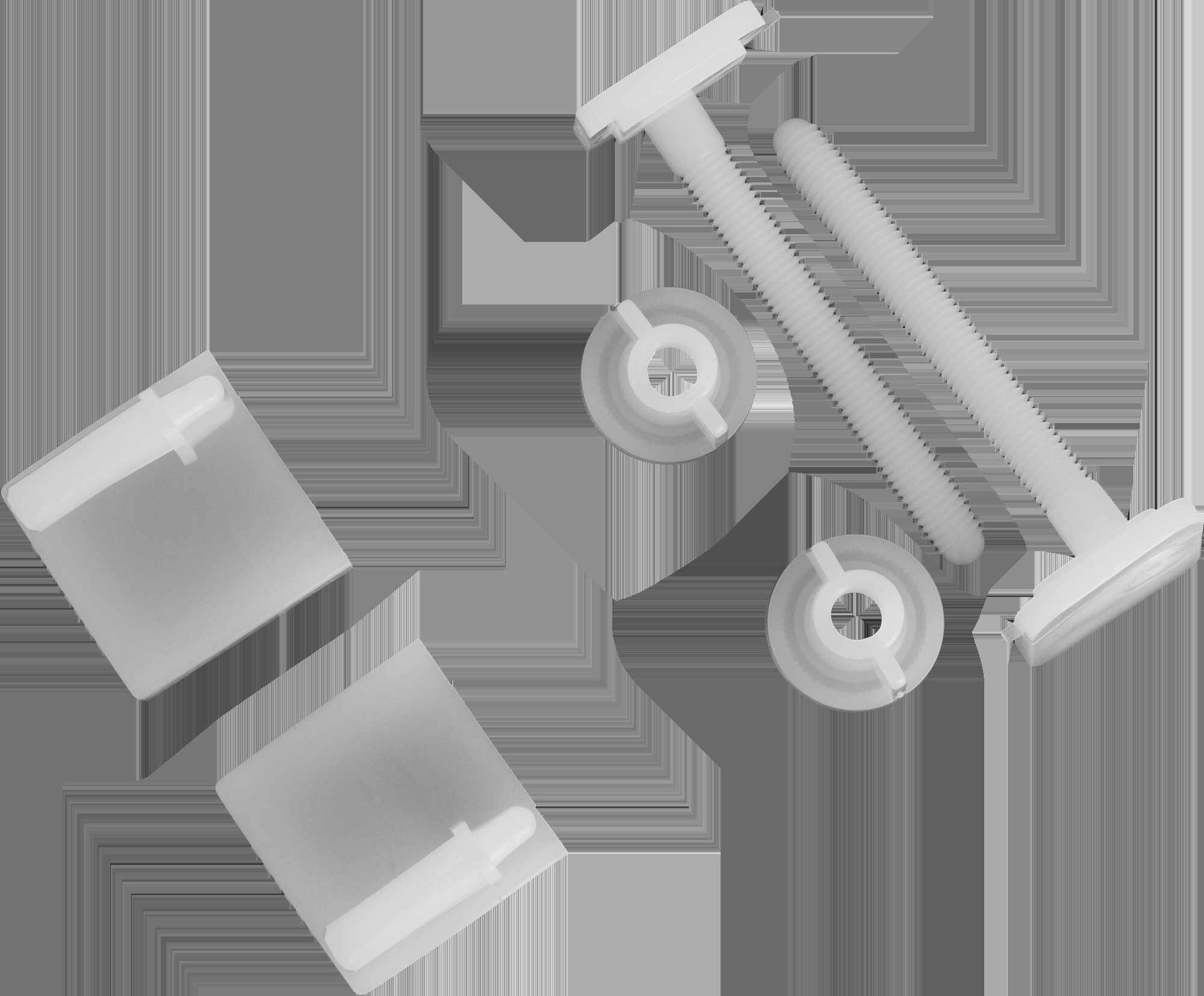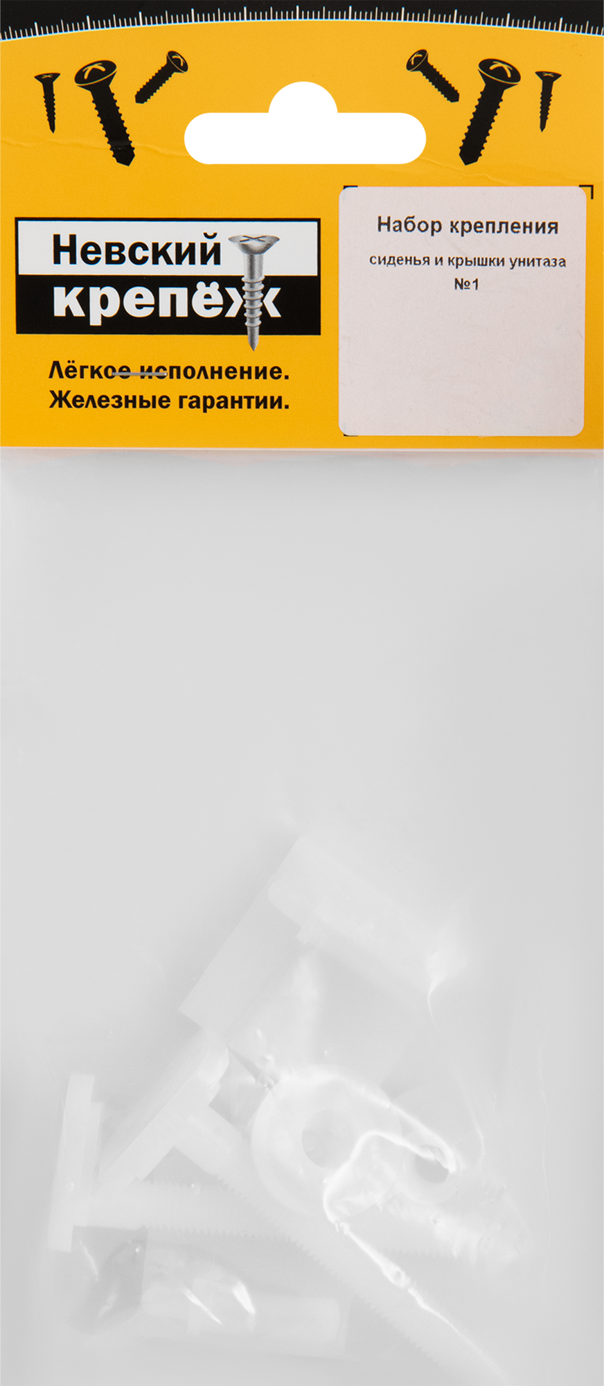 **Набор крепления сиденья и крышки унитаза №1** — комплект деталей, изготовленных из полипропилена, который не вступает в реакцию со многими средствами. Благодаря непористой структуре материал обеспечивает максимальную гигиеничность. Все изделия окрашены в универсальный белый цвет.