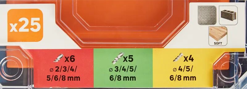 | Состав набора (количество и тип) | Сверла по дереву: 3,4,5,6,8 мм; Сверла по бетону: 4,5,6,8 мм;Сверла по металлу 2,3,4,5,6,8мм , биты 9 штук, |