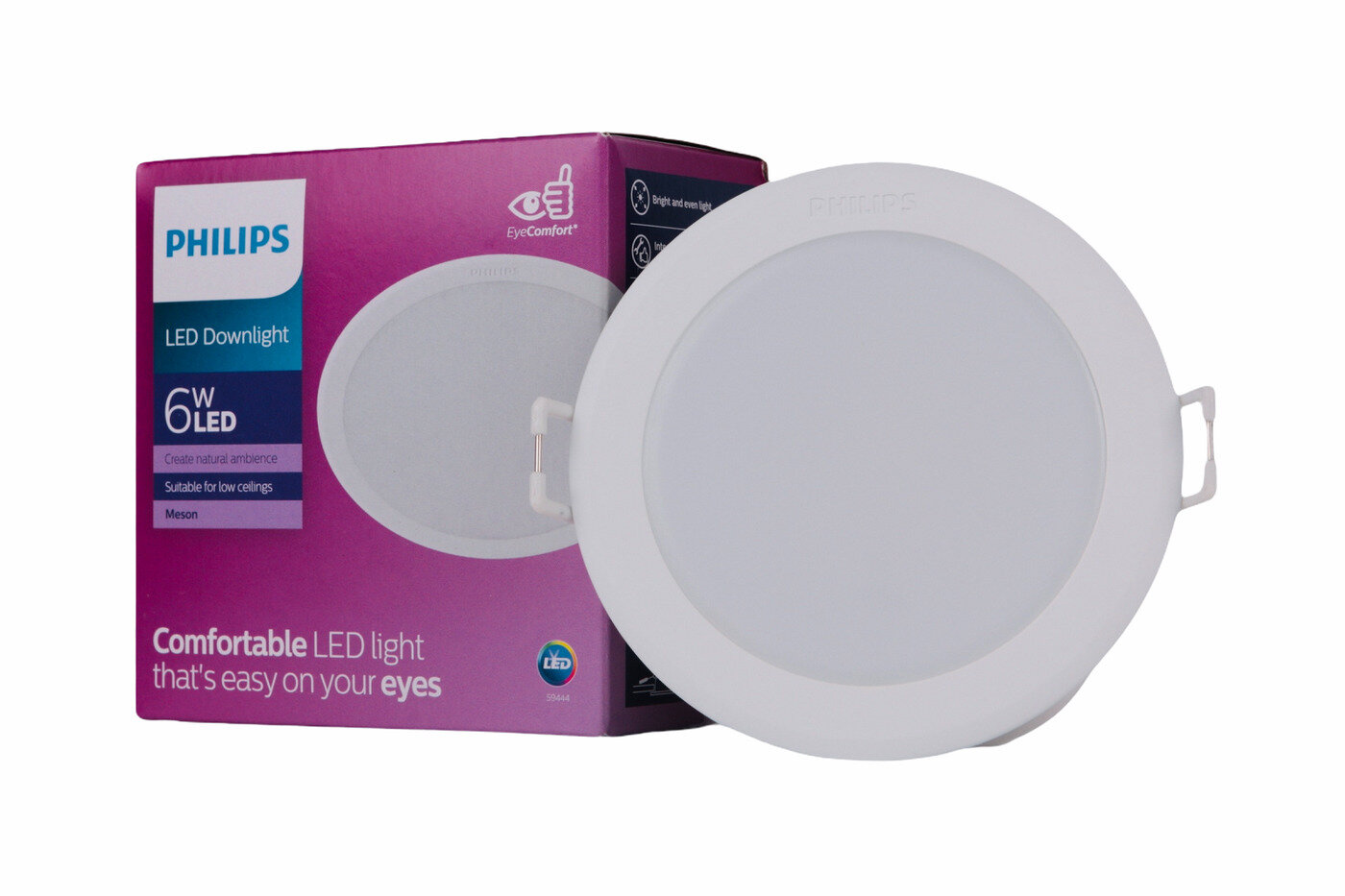 **Светильник точечный светодиодный встраиваемый Philips «Meson»** — надежная и простая в эксплуатации модель, которая монтируется в пустотелую поверхность, в том числе подвесной потолок. Рассчитана на монтаж под отверстие 80 мм. Конструктивные части выполнены из пластика и металла. Отлично подходит для помещений разного назначения. Малые габариты и особая конструкция позволяет использовать такой источник света практически повсеместно. Прибор формирует нейтральный белый свет, который не перенапрягает зрение, обеспечивает комфортную обстановку. Луч сфокусированный, с небольшим углом рассеивания — это позволяет использовать светильник для организации дизайнерского интерьера.