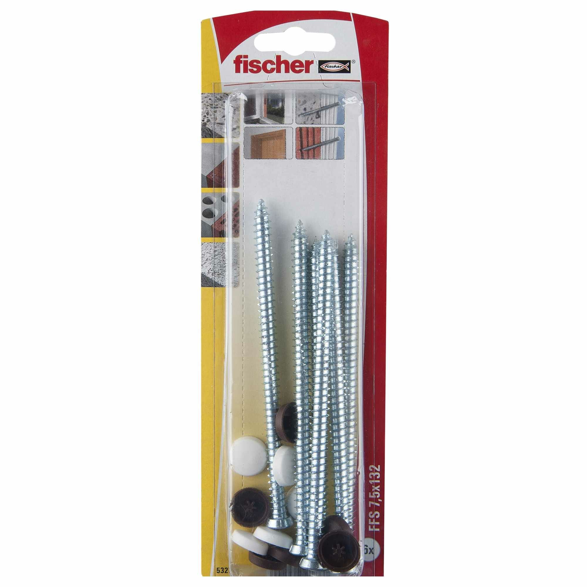 **Шуруп Fisher FFS K** предназначен для крепления рам и дверных коробок. Используется при установке дверных и оконных коробок из дерева, пластика и алюминия с креплением к стенам из различных материалов — кирпича керамического и силикатного полнотелого и пустотелого, монолитного бетона, легких газобетонных и газосиликатных блоков и т.д. Острый, что позволяет осуществлять монтаж с помощью электроинструмента (шуруповерта) через материал оконной или дверной рамы и материал основания. Комплектуется декоративными колпачками, которые скрывают крепление и придают эстетичный внешний вид соединению.