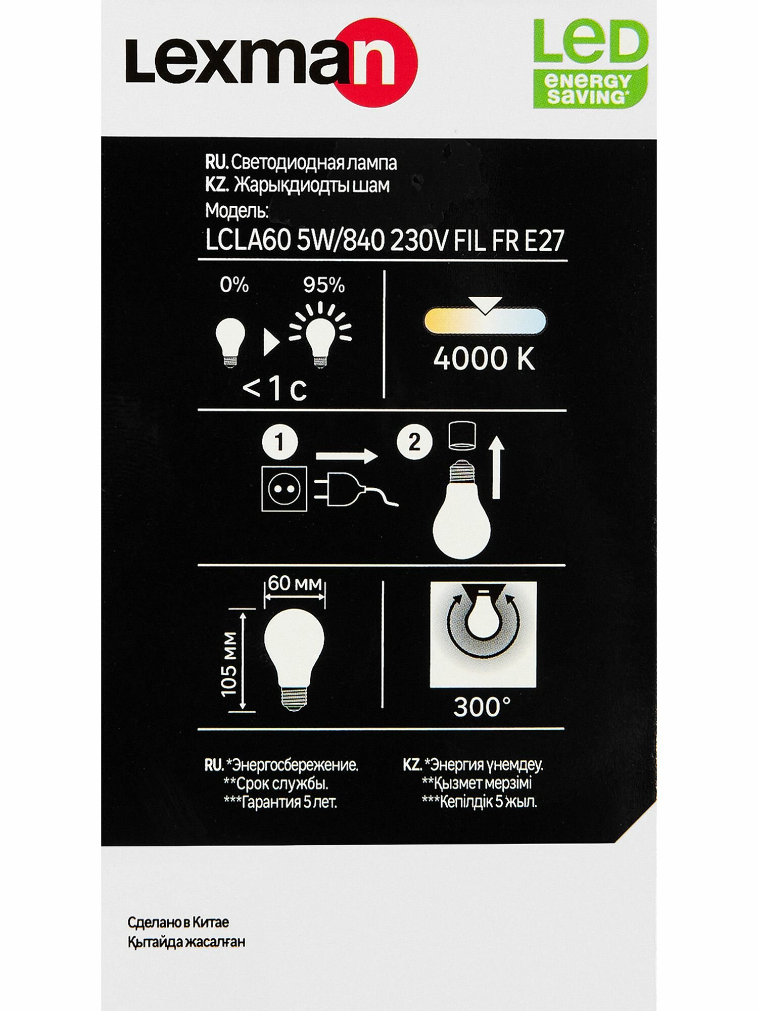| Аналог лампы накаливания (Вт) | 60 |