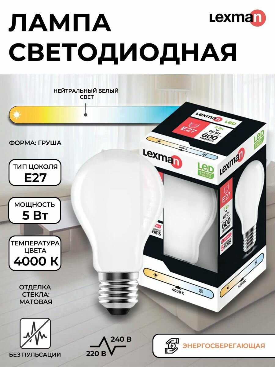 Лампа светодиодная Lexman E27 220-240 В 5 Вт груша матовая 600 лм нейтральный белый свет