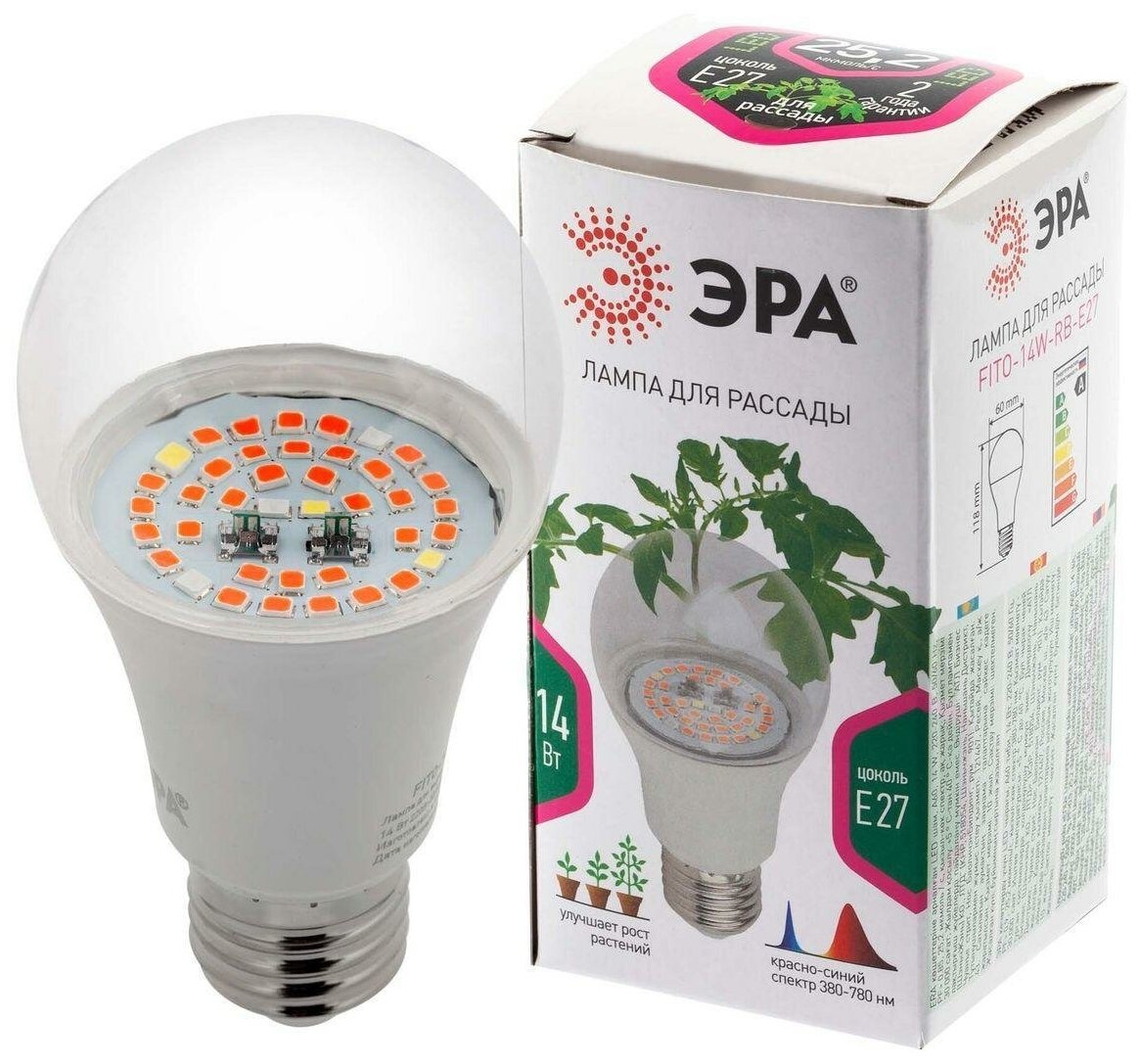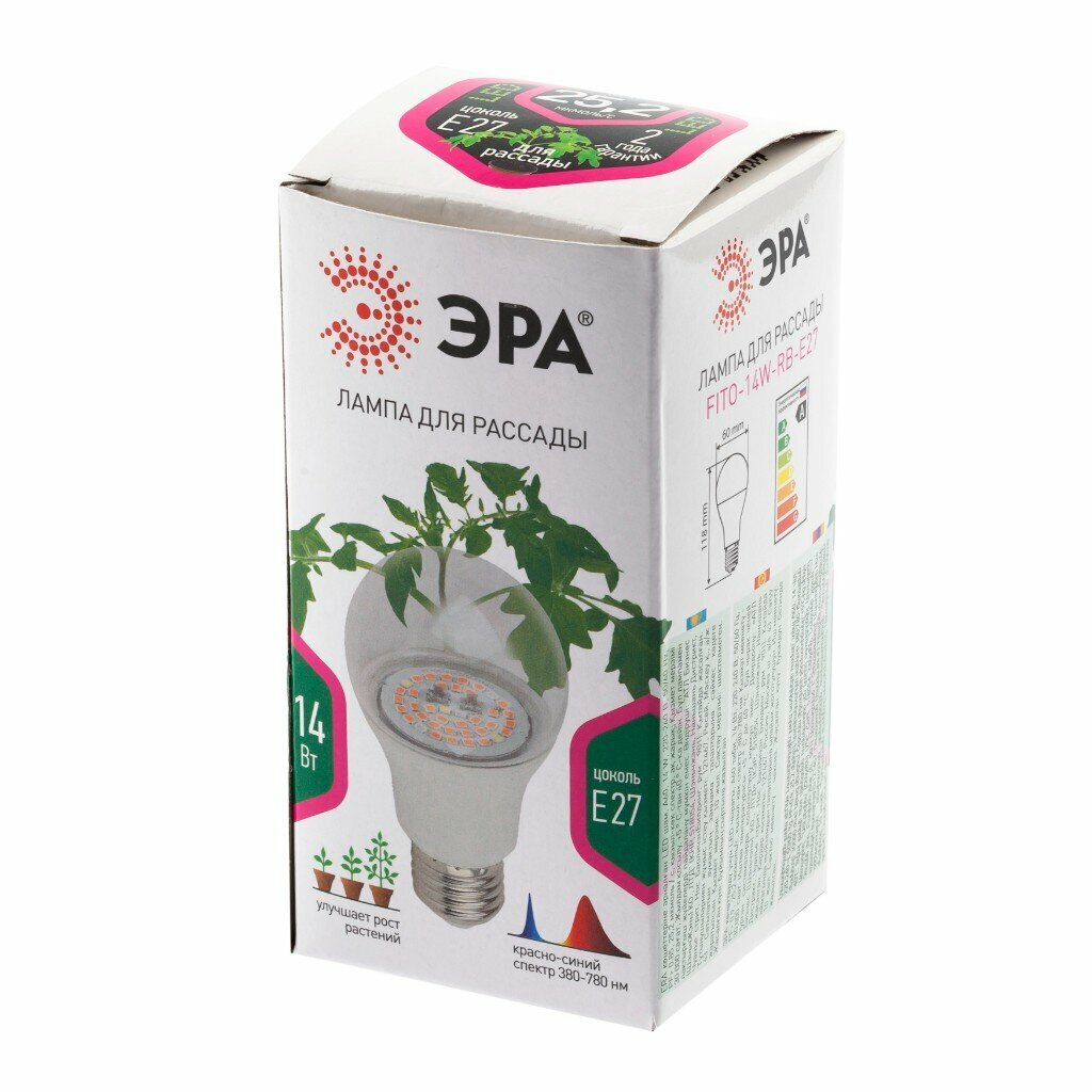 **Лампа ЭРА FITO-14W-RB-E27** мощностью 14 Вт – лучший помощник для домашних растений. Вы сможете озеленить свое пространство на кухне, балконе или подоконнике. Оптимальное расстояние до листьев – 10-15 см. Важно: расположение на высоте более 40 см не дает должного эффекта при выращивании для любой фитолампы аналогичной мощности.