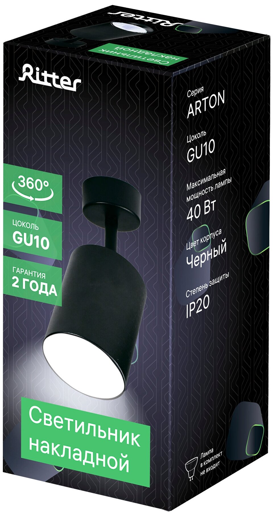 На сегодняшний день товар «Спот поворотный точечный накладной Ritter Arton 59973 9 GU10 цвет черный» можно купить с кешбеком в 1 магазине: Яндекс.Маркет