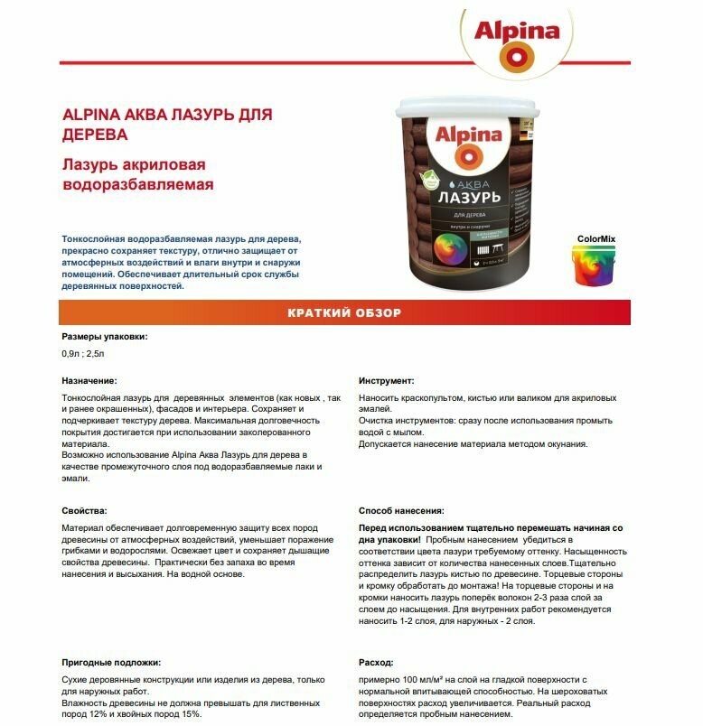 | Инструкция по применению | Наносить краскопультом, кистью или валиком для акриловых эмалей. Очистка инструментов: сразу после использования помыть водой с мылом. Перед использованием тщательно перемешать начиная со дна упаковки! Пробным нанесением убедиться в соответствии цвета лазури требуемому оттенку. Насыщенность оттенка зависит от количества нанесенных слоев. При наружных работах предварительно нанести грунтовочный слой Alpina Грунтовка по дереву. Второй и третий слой Alpina Аква Лазурь для дерева нанести в неразбавленном виде плоской кистью (флейцем) в направлении волокон. На торцевые стороны и на кромки наносить лазурь поперёк волокон 2-3 раза слой за слоем до насыщения. Для внутренних работ рекомендуется наносить 1-2 слоя, для наружных - 2 слоя. |