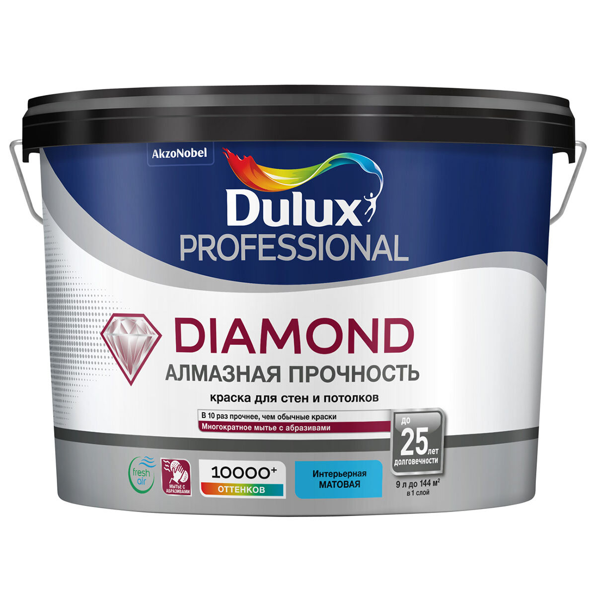 **Краска для стен и потолков Dulux Professional Diamond** требует подготовки основания под грунтовку. Заявленный срок защиты при соблюдении технологии нанесения в 2 слоя достигает 25 лет. Применяется на любых поверхностях. Время полного высыхания составляет 6 ч. Укрывистость — 16 м². Используется для внутренних работ. Не содержит запах, что делает актуальным применение в жилых помещениях.