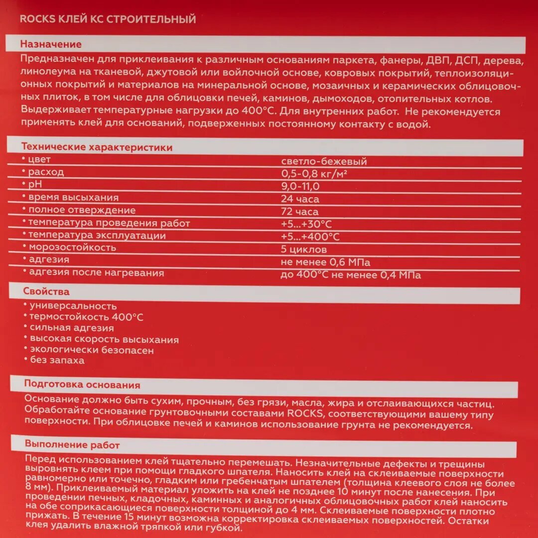 **Клей КС Строительный ROCKS** предназначен для приклеивания к поверхностям из паркета, фанеры, ДВП, ДСП, дерева, линолеума ковровых покрытий, теплоизоляции на минеральной основе, мозаики, керамической и облицовочной плитки. В том числе используется для облицовки печей, каминов, дымоходов, отопительных котлов. Не рекомендован для использования в помещениях с повышенной влажностью.