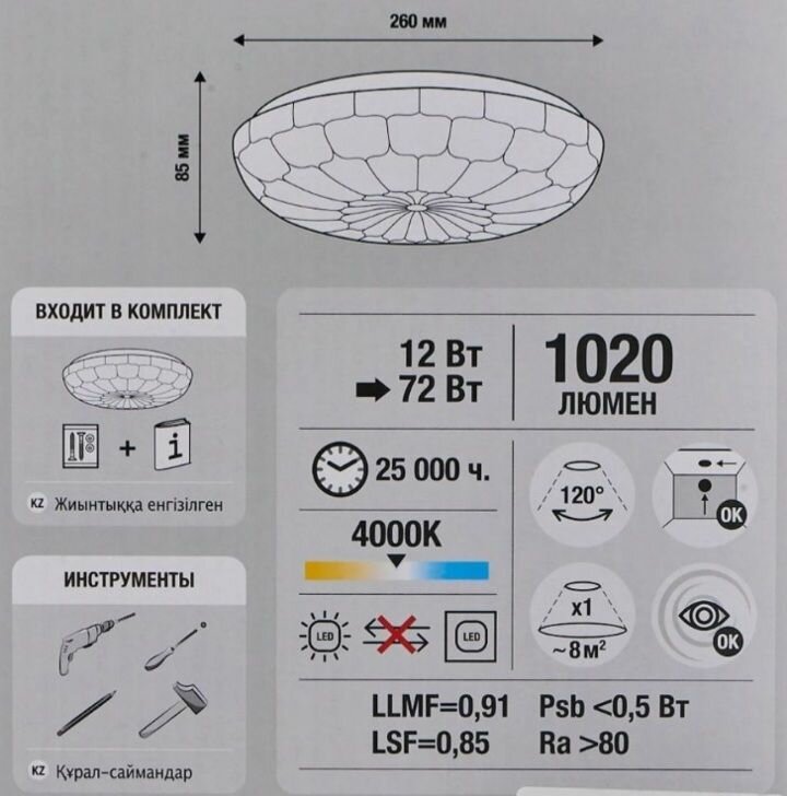 - Изделие обеспечивает освещение пространства площадью до 8 м².