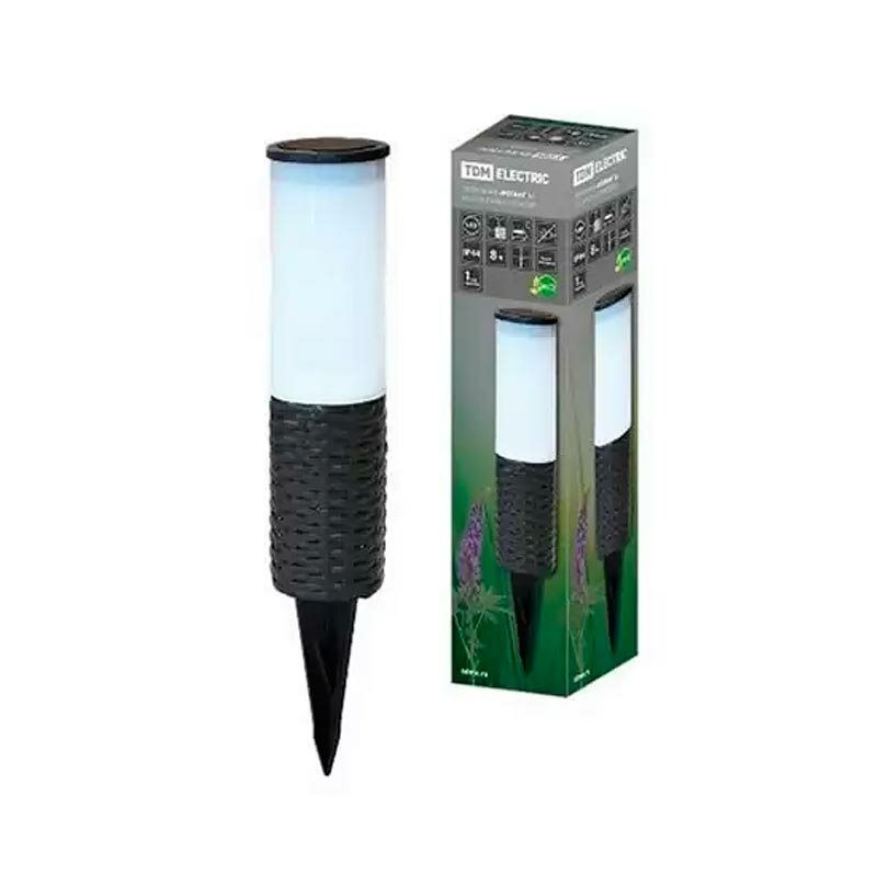 **Светильник TDM Electric «Ротанг-1»** с датчиком освещенности предназначен для освещения газонов и клумб, оснащен встроенными светодиодами. Автономный, работает от солнечной батареи, время непрерывного свечения при полном заряде достигает 8 ч. Устанавливается путем погружения нижней части в грунт. Корпус размером 8 × 48 × 8 см выполнен из пластика, цвет — коричневый. Страна производства — Китай.