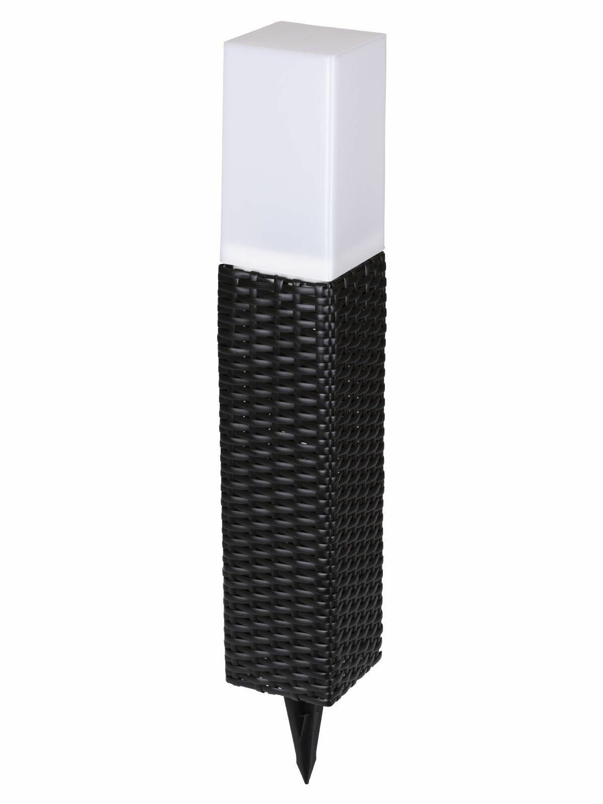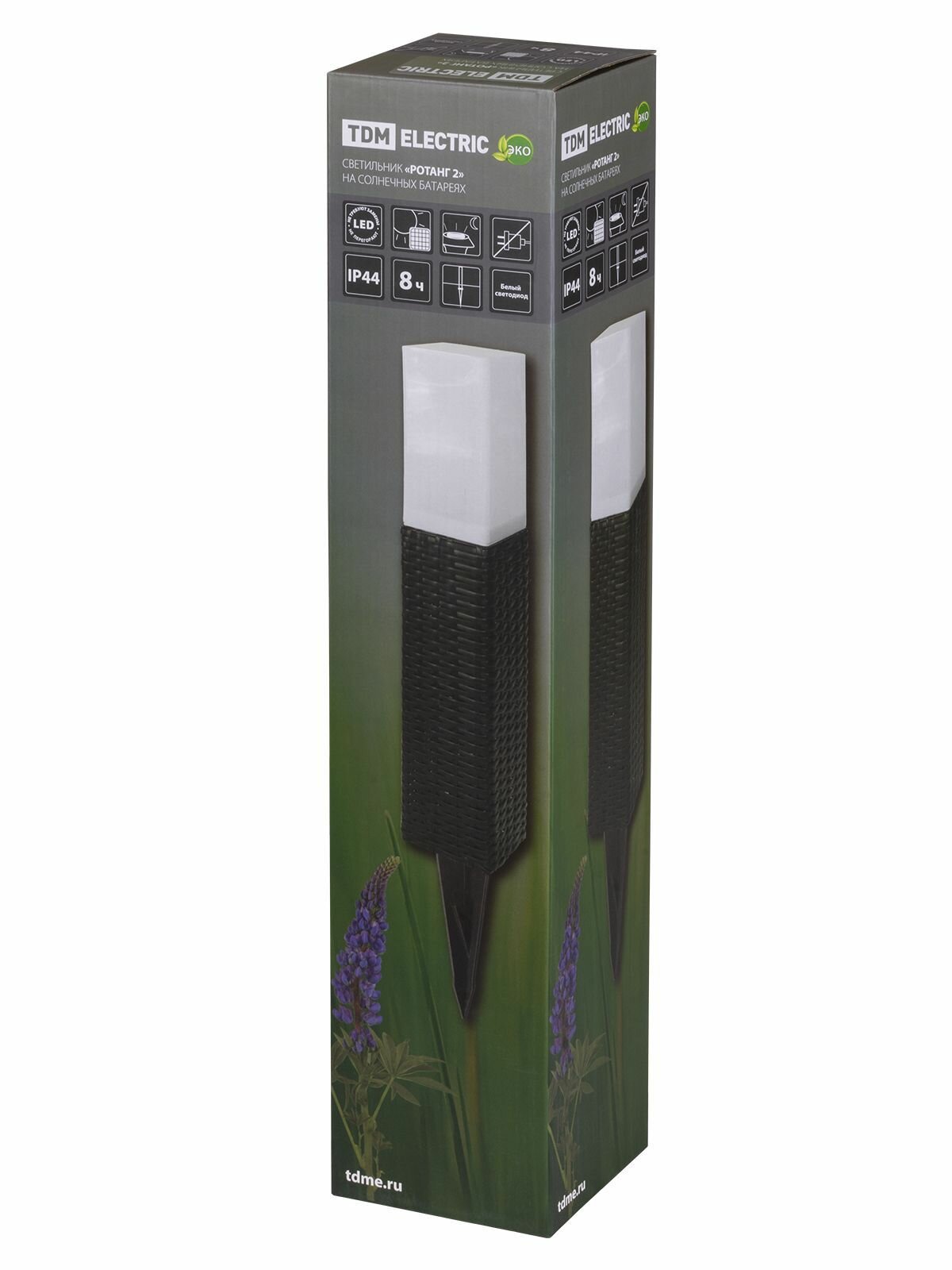 **Светильник TDM Electric «Ротанг-2»** с датчиком освещенности предназначен для освещения газонов и клумб, оснащен встроенными светодиодами. Автономный, работает от солнечной батареи, время непрерывного свечения при полном заряде достигает 8 ч. Устанавливается путем погружения нижней части в грунт. Корпус размером 10,3 × 51 × 10,3 см выполнен из пластика, цвет — коричневый. Страна производства — Китай.