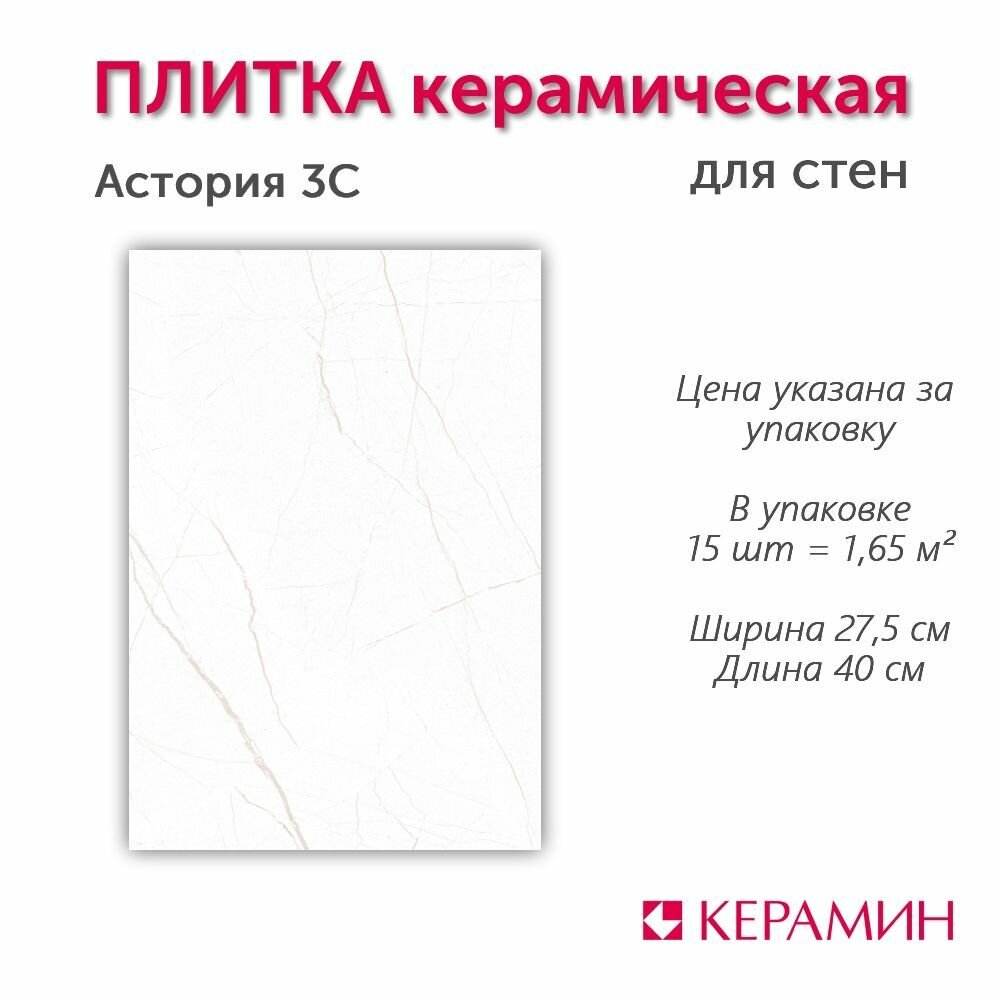 **Плитка настенная Керамин Астория 3С** отличается глянцевой поверхностью. Может использоваться для оформления целой стены или отдельного участка, полного покрытия. Подходит для эксплуатации внутри помещений, не характеризуется устойчивостью к отрицательным температурам. Края не ректифицированы. Минимальная ширина шва при укладке должна составлять 2 мм. Уход за гладким покрытием выражается в использовании влажной мягкой ветоши и средств бытовой химии без абразивных частиц.
