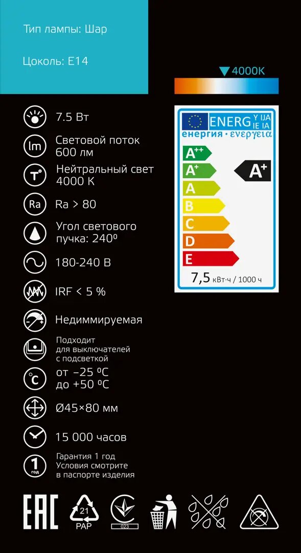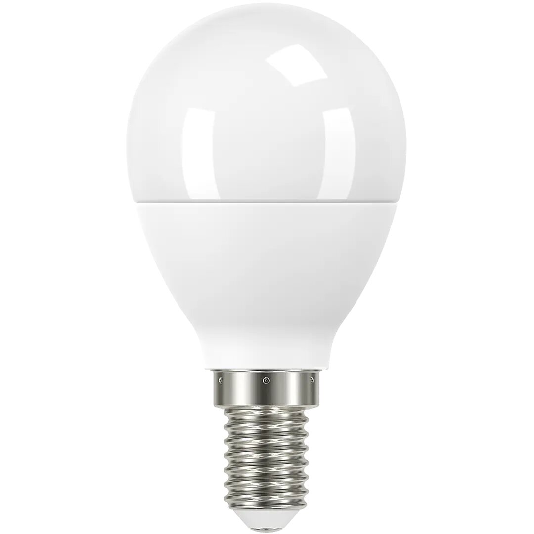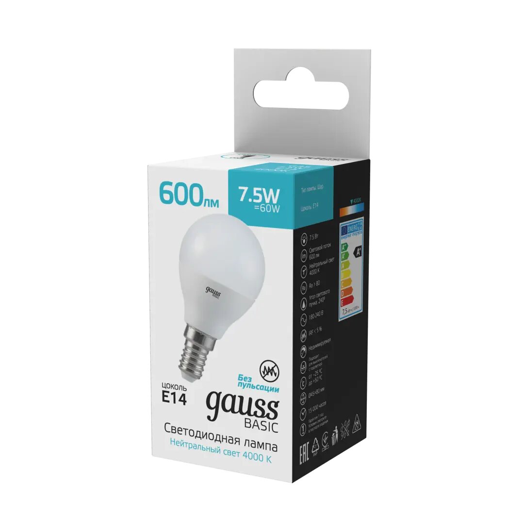 **Лампа Gauss Шар** светодиодная изготовлена в форме шара диаметром 45 мм, запитывается от электросети с напряжением 220-240 В. Потребляемая мощность — 7,5 Вт, цоколь — Е14. Светит белым нейтральным цветом (4000 K). Световой поток — 600 лм (норма освещенности на м² помещения — 150-200 лм).