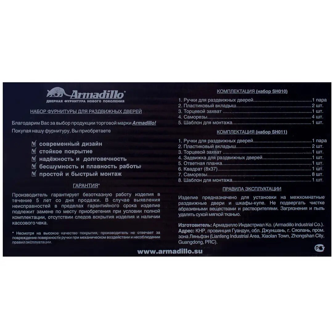 **Набор для раздвижных дверей Armadillo SH011-BK** — комплект механизмов и устройств для управления полотном и запирания дверей с раздвижным типом открывания. Устанавливается на межкомнатные двери и шкафы-купе. По внешнему виду и конструктивным особенностям элементы из набора совместимы с любой фурнитурой одноименного бренда, остается только выбрать нужный цвет.