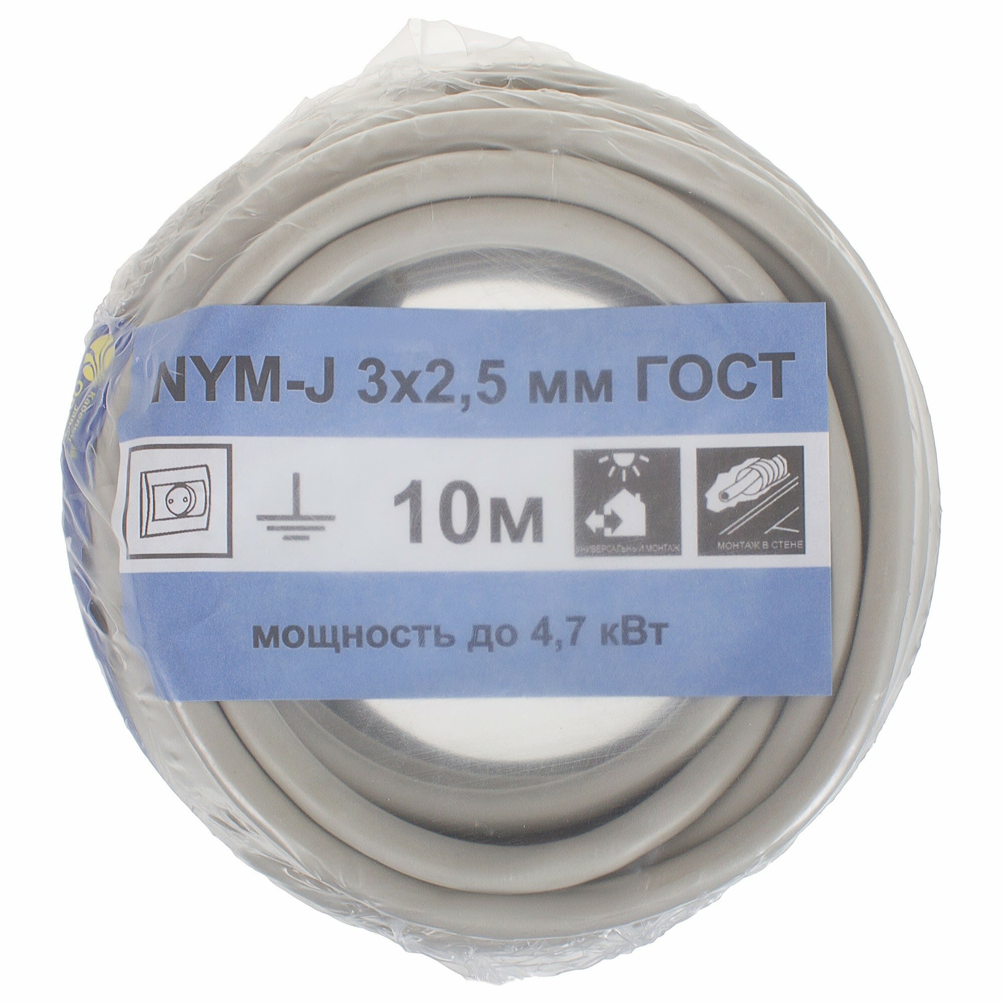 Скачать инструкцию Кабель NYM — это универсальный провод, изготавливаемый по немецкому стандарту. По техническим параметрам приближен к кабелю марки ВВГзнг. ### Особенности использования кабеля - Допускается эксплуатация в сухих и влажных помещениях. - Возможен скрытый и открытый монтаж. - Провод не поддерживает горение при одиночной укладке. - Использование на открытом воздухе допускается только при создании защиты от прямого попадания ультрафиолетовых лучей (в металлорукаве или гофре). - Не рекомендуется прокладка в земляных траншеях. - Запрещена запрессовка кабеля в бетон. Характеристики: - Проводники медные, оболочка и изоляция жил изготовлены из самозатухающего поливинилхлорида. - Кабель имеет промежуточный слой из негорючей невулканизированной резины, предназначенный для герметизации. - 3 жилы. - Форма круглая, длина — 10 м.